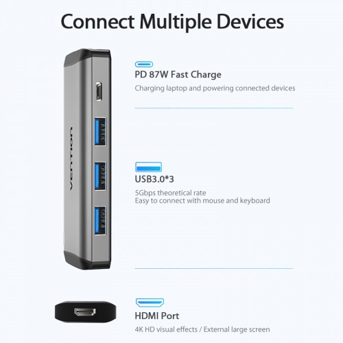 Ультра компактный и прочный мультифункциональный хаб, позволяет увеличить количество разъемов на устройстве с разъемом USB Type C. Благодаря 3 разъемам OTG USB 3.1 Gen 1, одновременно можно подключать, или заряжать до 3 устройств. Разъем HDMI v2.0 передаст аудио и видео сигнал на проектор или монитор. Разъем USB Type C можно использовать для зарядки устройств. Поддерживает технологию Plug and Play, тем самым, не требуя установки дополнительного программного обеспечения и драйверов.