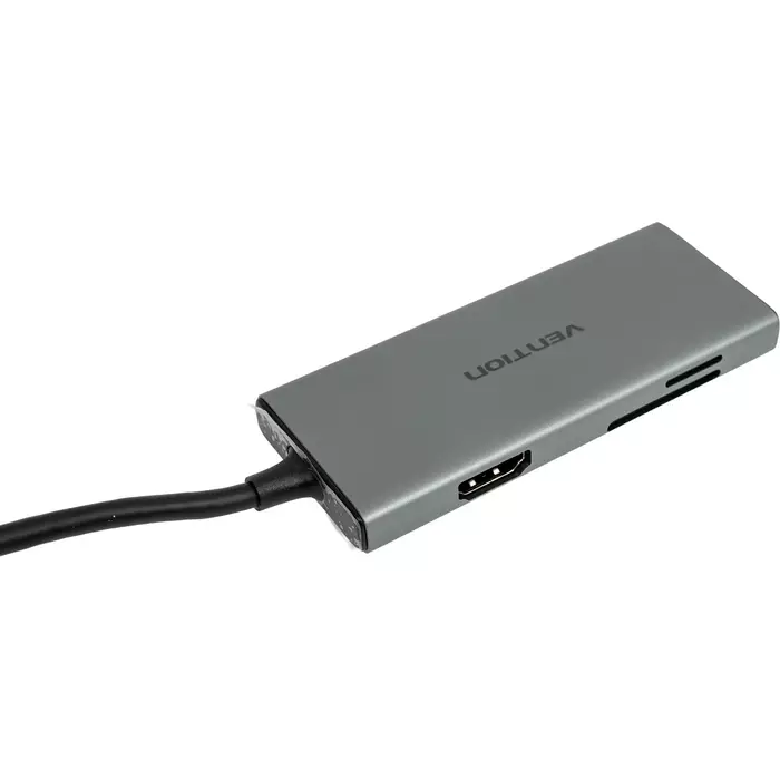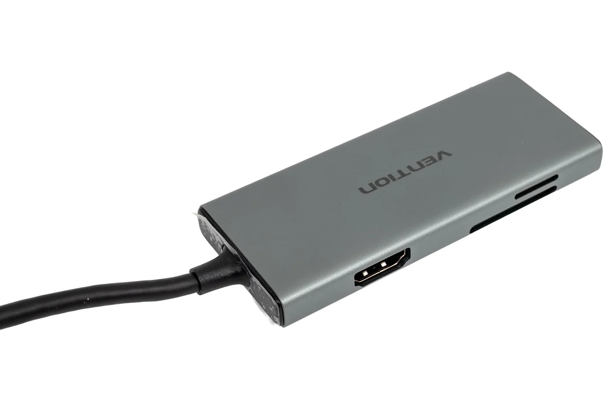 Многофункциональный хаб предназначен для расширения количества разъемов устройства с портом USB Type-C. Устройство оснащено слотами для чтения карт памяти с поддержкой объема до 256 ГБ. Дополнительно предусмотрены три порта USB 3.0, позволяющие одновременно подключать или заряжать до трех устройств. Интерфейс HDMI обеспечивает передачу аудио- и видеосигнала на проекторы или мониторы. Хаб поддерживает технологию Plug and Play, что исключает необходимость установки дополнительного программного обеспечения или драйверов.