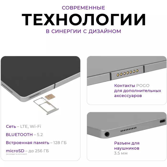 Комплект поставкиПланшет, Кабель USB Type-C, Блок питания 20 Вт, Скрепка для извлечения SIM / SD-карт, Пассивный стилус, Документация