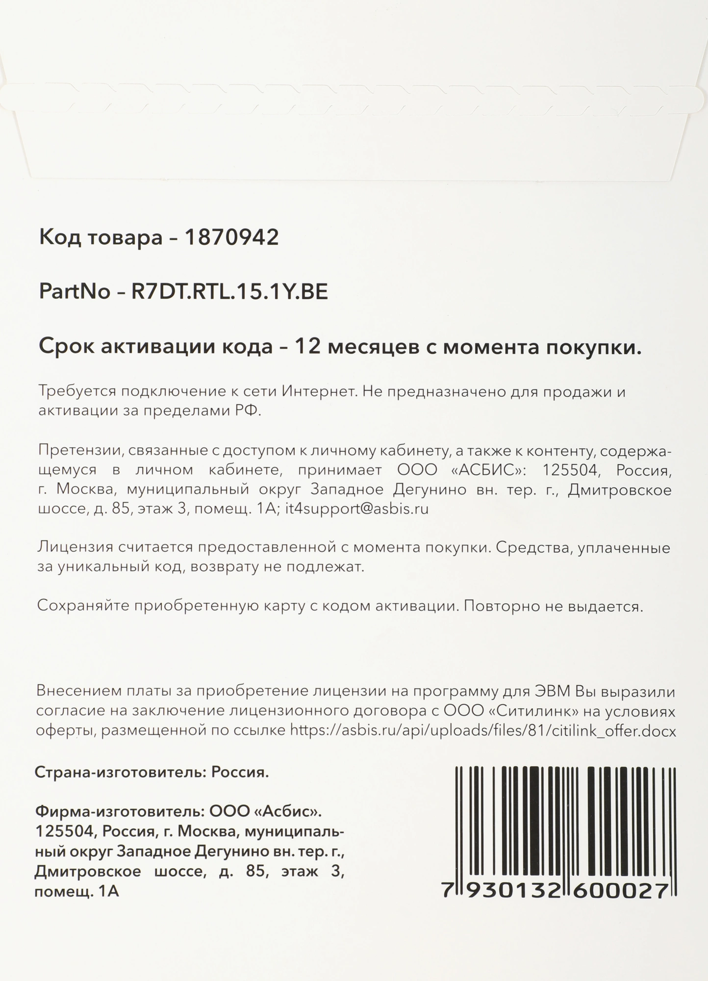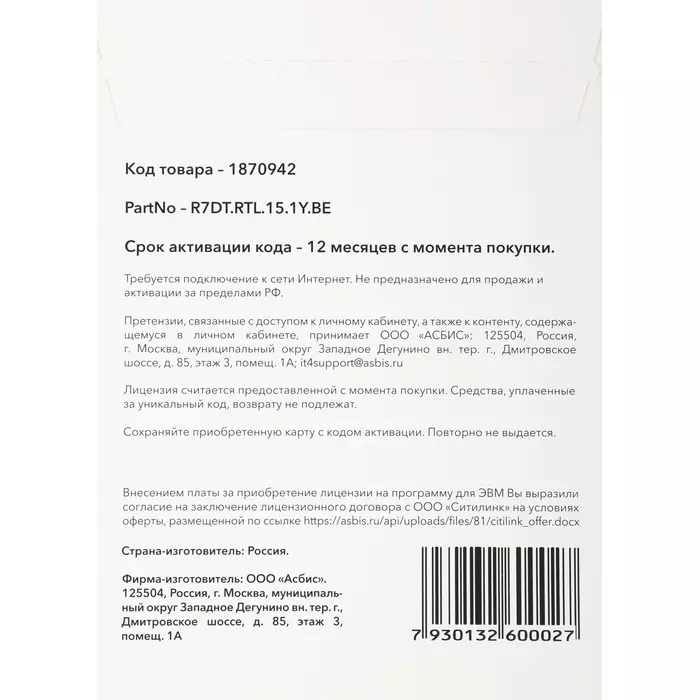 | Срок действия лицензии (мес.) | 12 мес |
