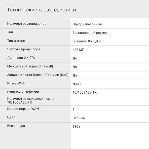 | Комплектация | Wi-Fi роутер, сетевой адаптер (9Вольт, 0.6А), кабель Ethernet, руководство пользователя |