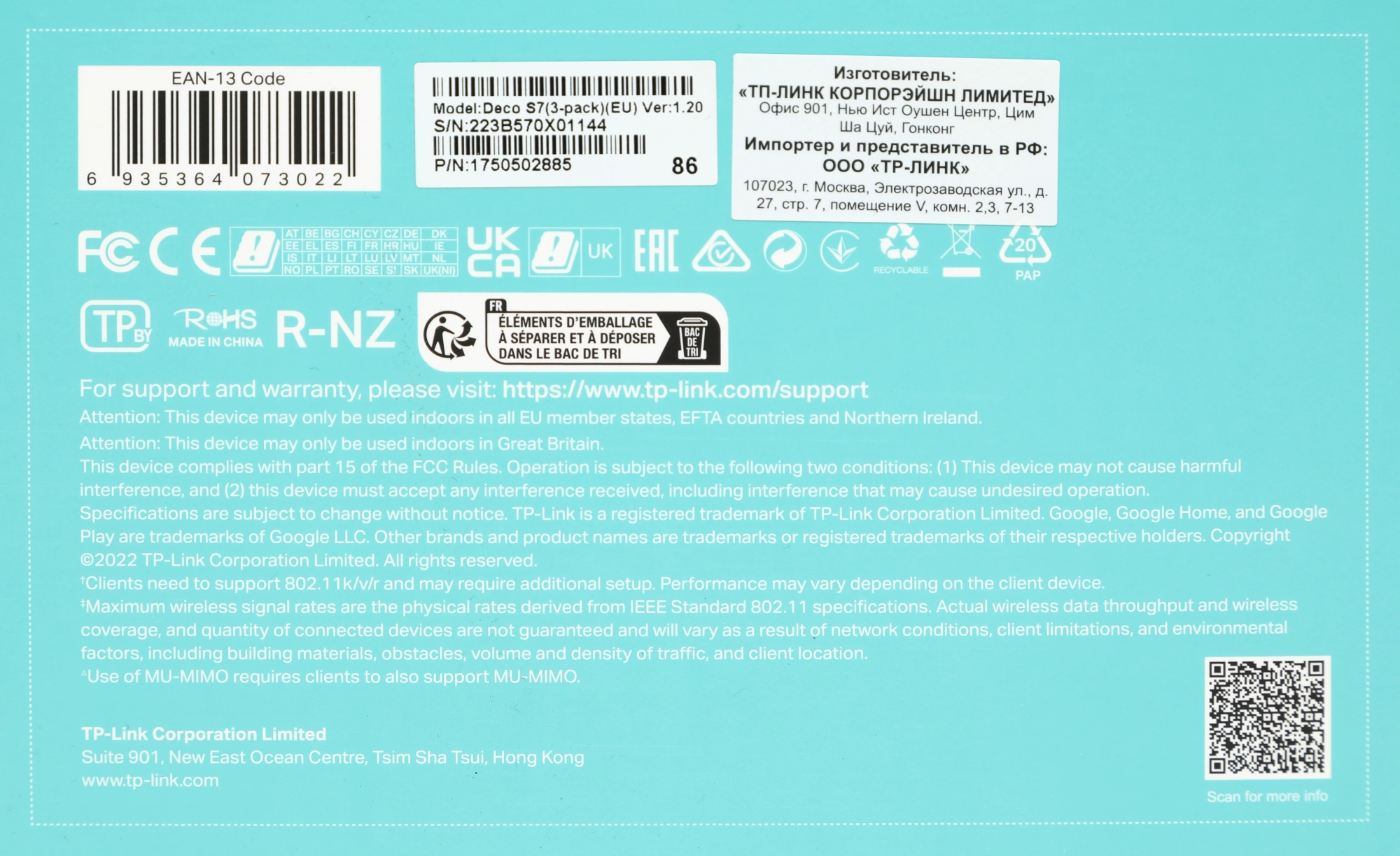 | Комплектация | Deco S7 (3 шт.), кабель Ethernet RJ45, адаптер питания (3 шт.), краткое руководство по настройке. |