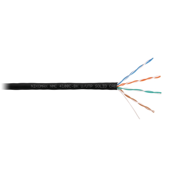 Кабель Nikomax NMC 4100C-BK U/UTP 4 пары, Кат.5e (Класс D), тест по ISO/IEC, 100МГц, одножильный, BC (чистая медь), 24AWG (0,51мм), полимерный материал нг(А)-HF, внутренний/внешний, черный, 305м