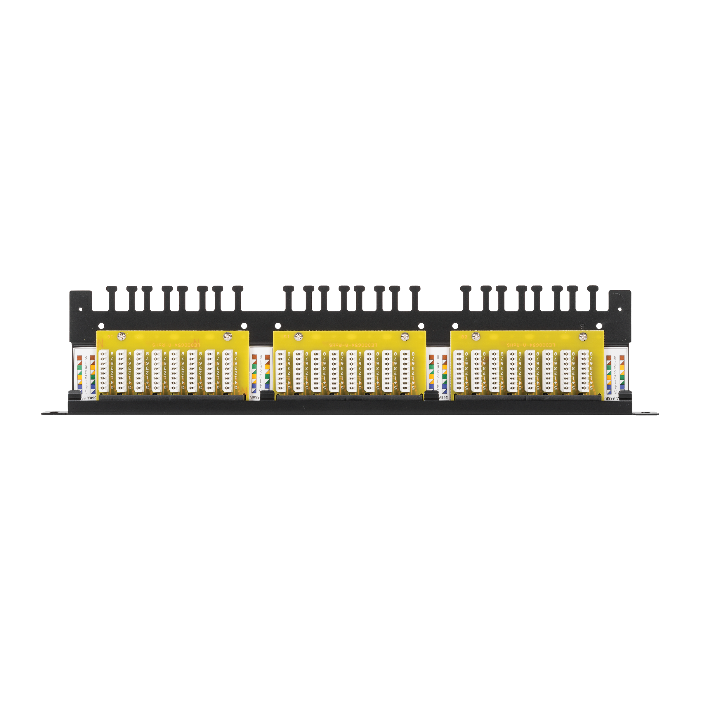 Коммутационные панели (патч-панели) предназначены для монтажа кабелей в различных подсистемах СКС и подключения отдельных составляющих сети друг к другу при помощи коммутационных шнуров. Панели высокой плотности NMC-RP24UE2-HU-BK (кат.6) выполнены в неэкранированных корпусах и предназначены для монтажа в 19” шкафы или стойки. Данные панели вмещают по 24 порта RJ45/8P8C при высоте всего 0,5U. Такое решение идеально, когда необходимо обеспечить высокую плотность портов (например, в дата-центрах) или для расширения сети в ограниченном пространстве шкафа. Универсальные IDC контакты 110/KRONE расположены с тыльной стороны панелей, на горизонтальной подложке. Разводка кабелей на патч-панелях производится по двум стандартам: T568 А и B. Предусмотрен встроенный органайзер для надежного закрепления кабелей.