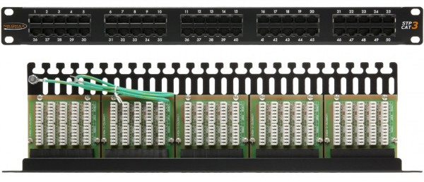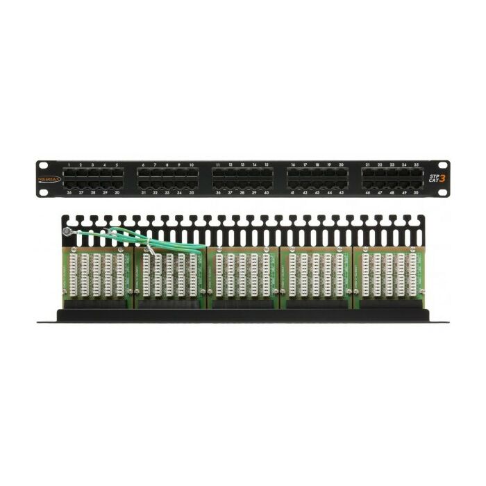 Патч-панель Nikomax NMC-RP50UC3-1U-BK 19", 1U, телефонная, 50 портов, Кат.3, RJ45/8P6C, 110/KRONE, с заземлением, с органайзером, черная