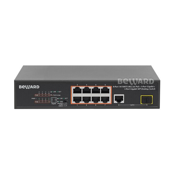 Неуправляемый коммутатор Beward ST-811HP 8 портов, 10/100 Мбит/с (все с поддержкой High PoE) + 1 порт 10/100/1000 Мбит/с Base-T + 1 порт 1000BASE-X mini-GBIC SFP, PoE бюджет 120 Вт, CCTV режим до 250м