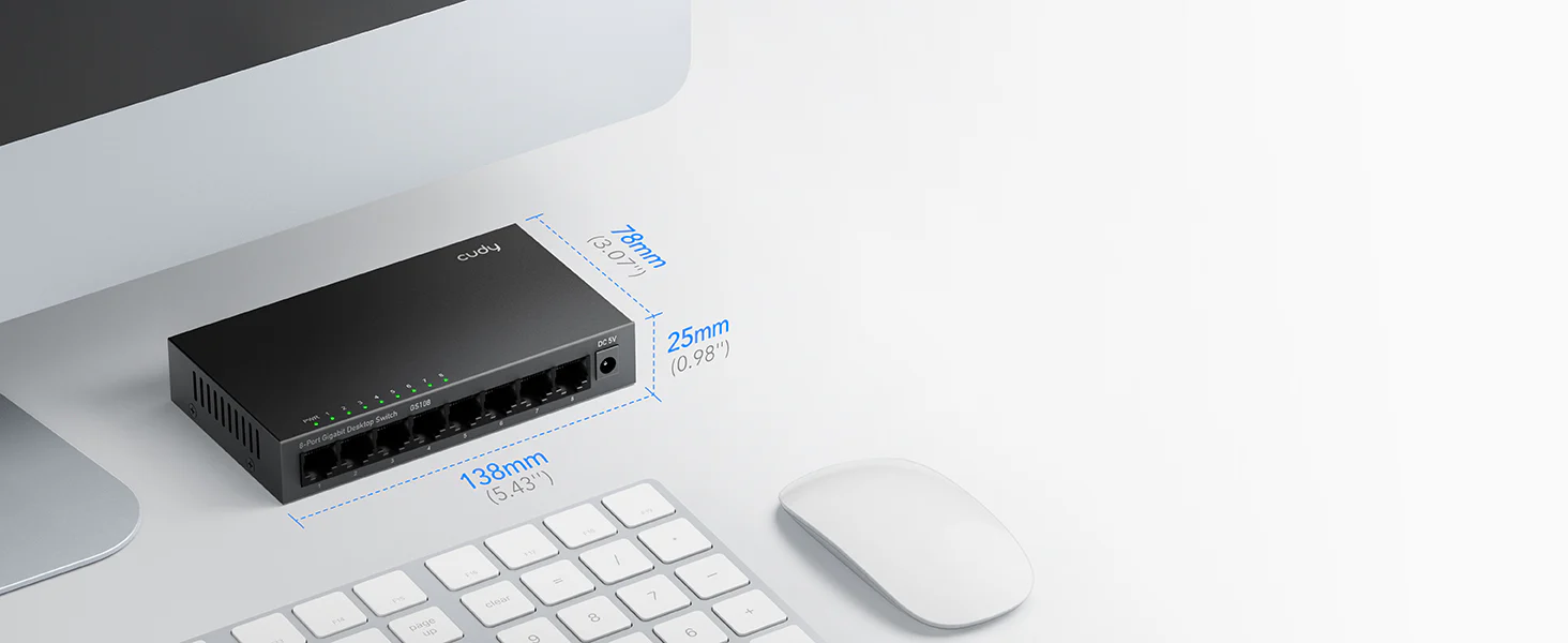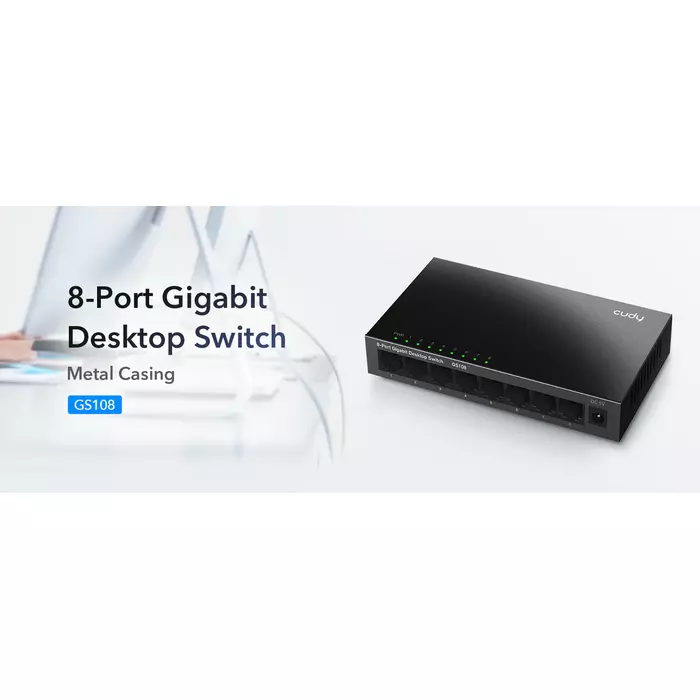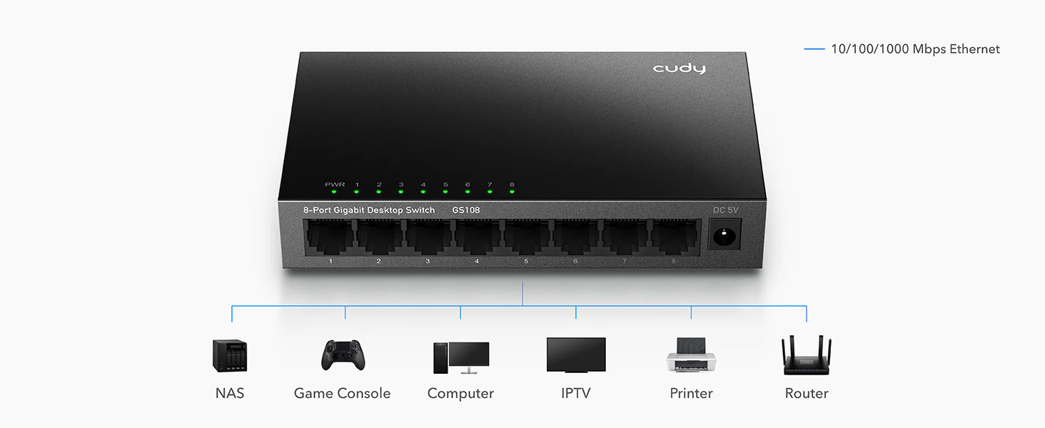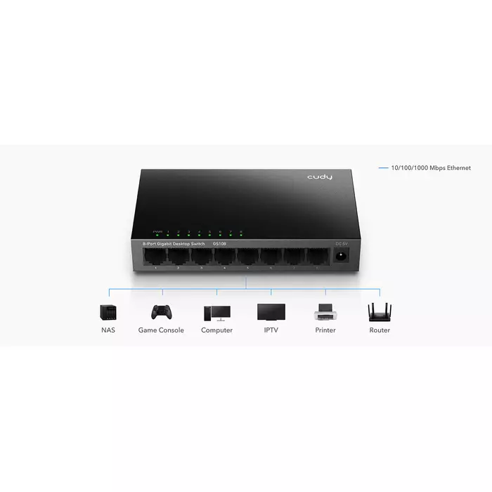 Cudy GS108 оборудован 8 портами с функцией автосогласования, обеспечивающими передачу больших файлов без помех на скорости до 1 Гбит/с. К устройству можно подключить ПК, принтеры, приставки, IP-камеры и датчики умного дома для создания локальной сети. Коммутатор функционирует в режиме store and forward, который позволяет временно хранить данные и проверять их на наличие ошибок. Благодаря неуправляемому типу устройства, его использование упрощается — подключение не требует дополнительных настроек, что делает его удобным для домашнего применения. Энергоэффективные технологии коммутатора автоматически регулируют энергопотребление при простое отдельных линий. Коммутационная таблица поддерживает до 1000 MAC-адресов.