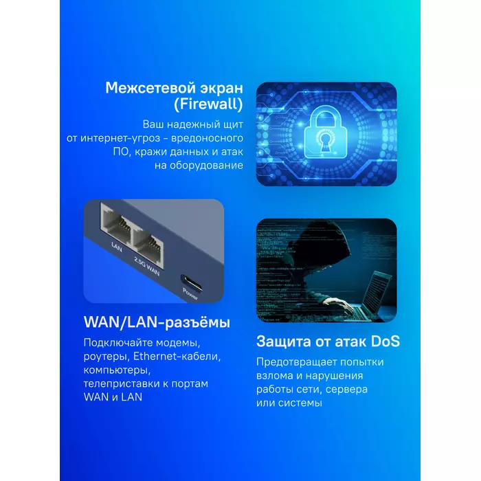 | Средства защиты сети | DMZ, DoS, Firewall, NAT, SPI, гостевая сеть |