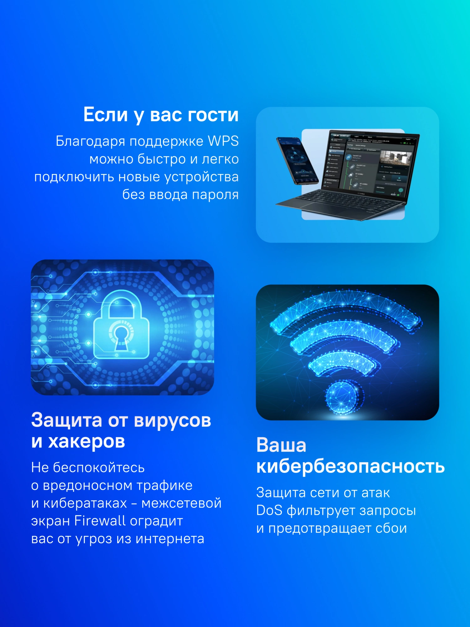 | Средства защиты сети | DMZ, DoS, Firewall, NAT, SPI, гостевая сеть, родительский контроль |