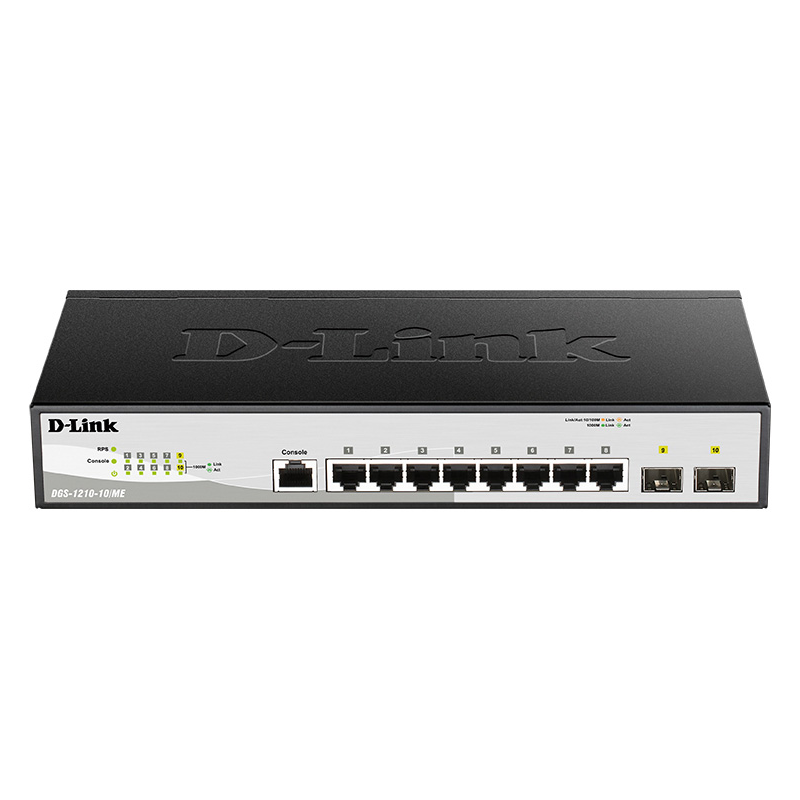 Коммутатор DGS-1210-10/ME является идеальным решением для применения в сетях Metro Ethernet. Данный коммутатор оснащен 8 портами 10/100/1000Base-T для подключения по витой паре, а также 2 SFP-портами, применяемыми для организации подключения к высокоскоростной магистрали.