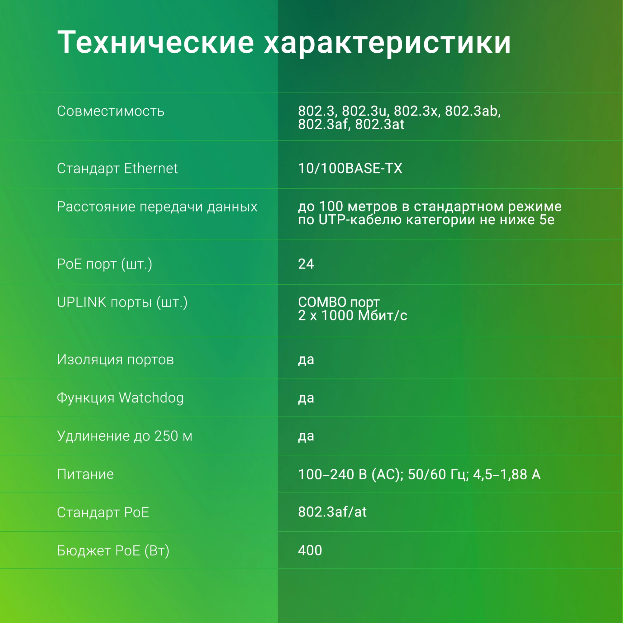 | Сетевые стандарты | 802.3, 802.3u, 802.3i, 802.3x, 802.3ab, 802.3af, 802.3at |