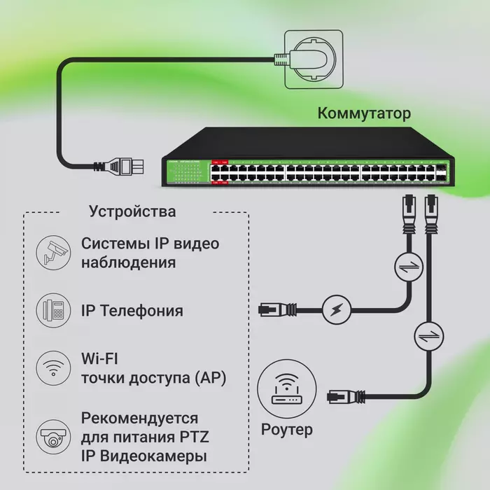 | Комплектация | Коммутатор PoE, крепление в стойку 19", кабель питания, гарантийный талон. |
