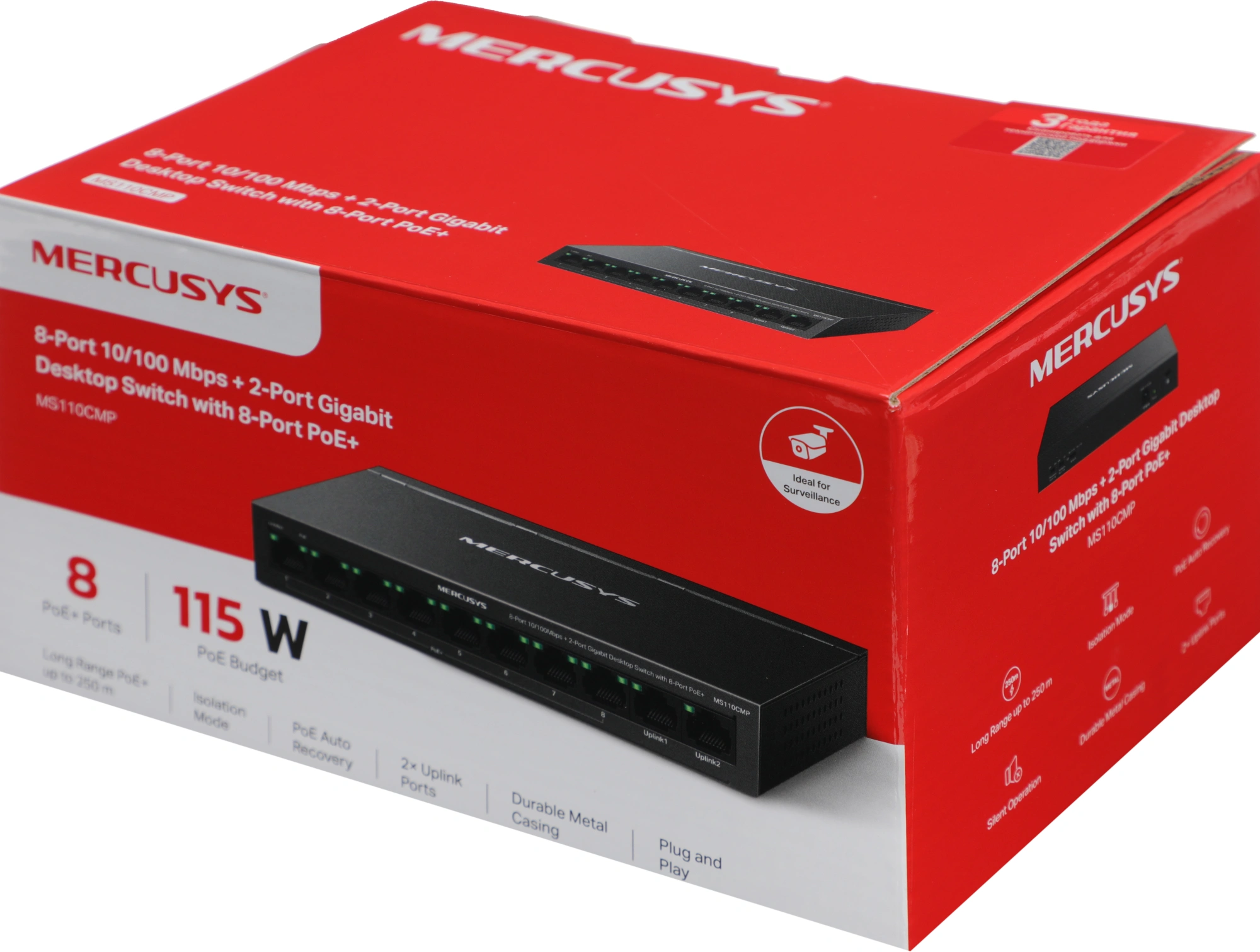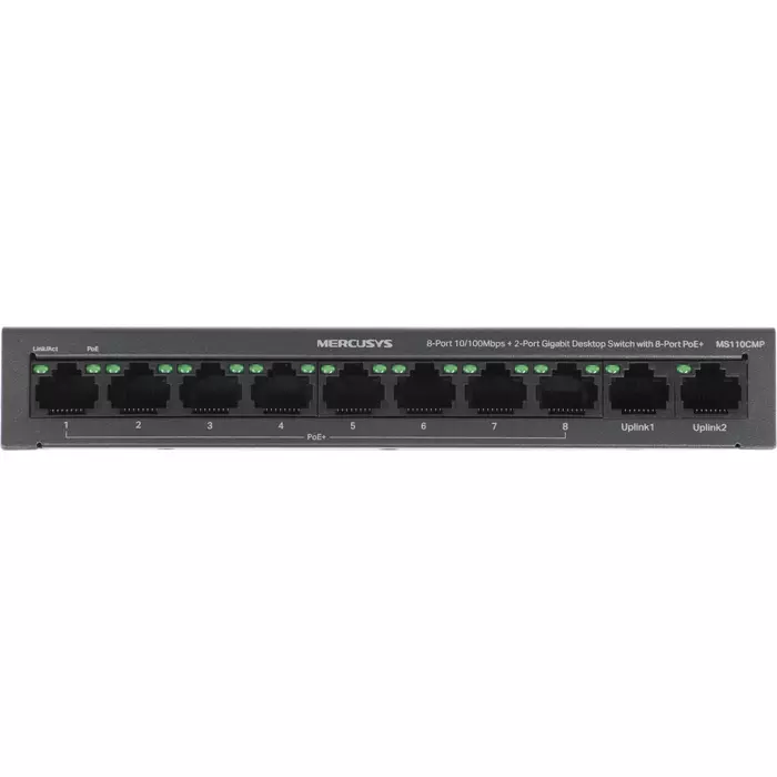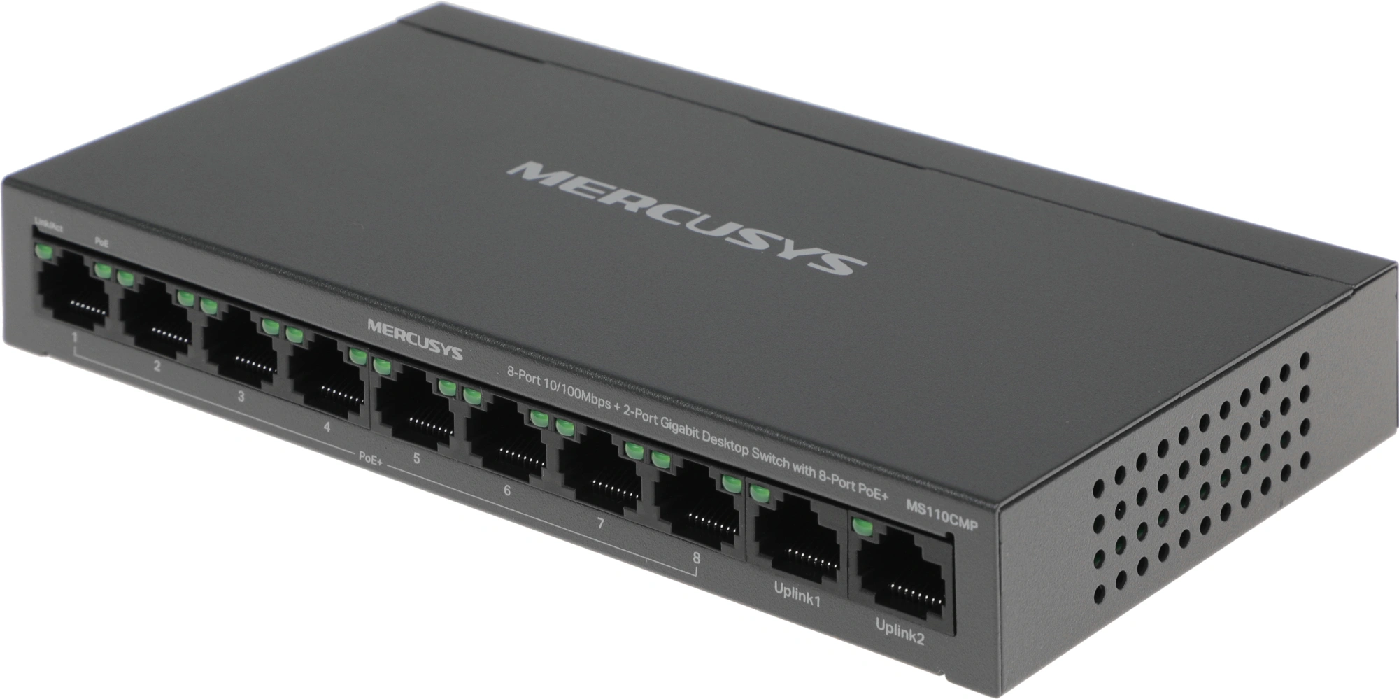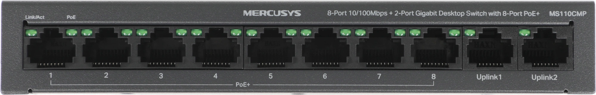 | Особенности | 10 портов: 8 портов PoE+ 10/100 Мбит/c и 2 гигабитных порта без PoE. |