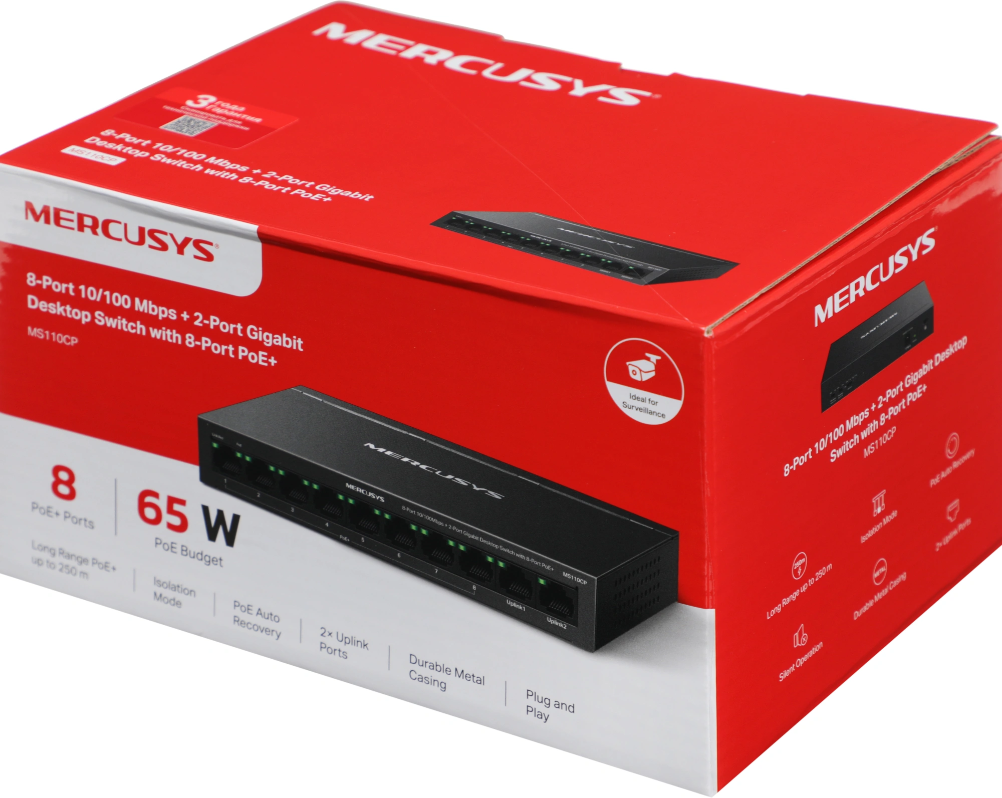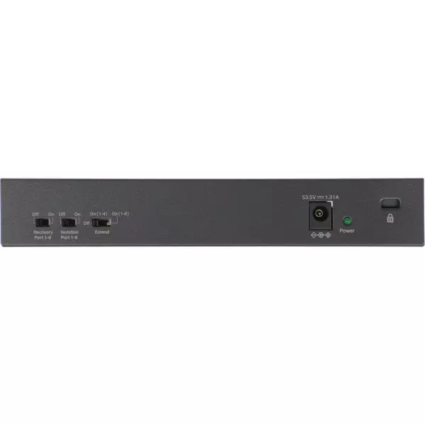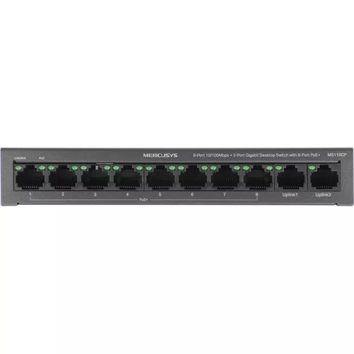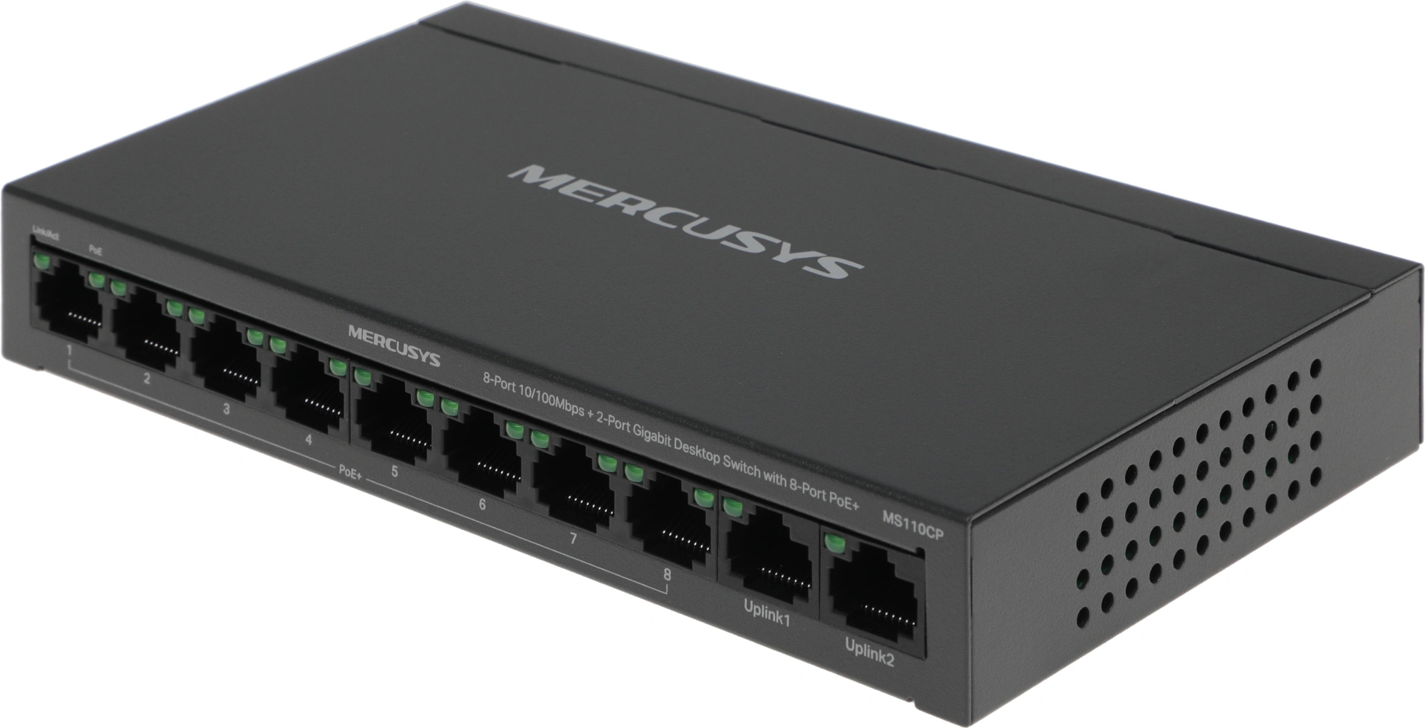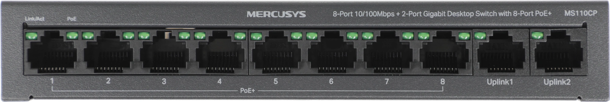 | Особенности | 10 портов: 8 портов PoE+ 10/100 Мбит/c и 2 гигабитных порта без PoE |