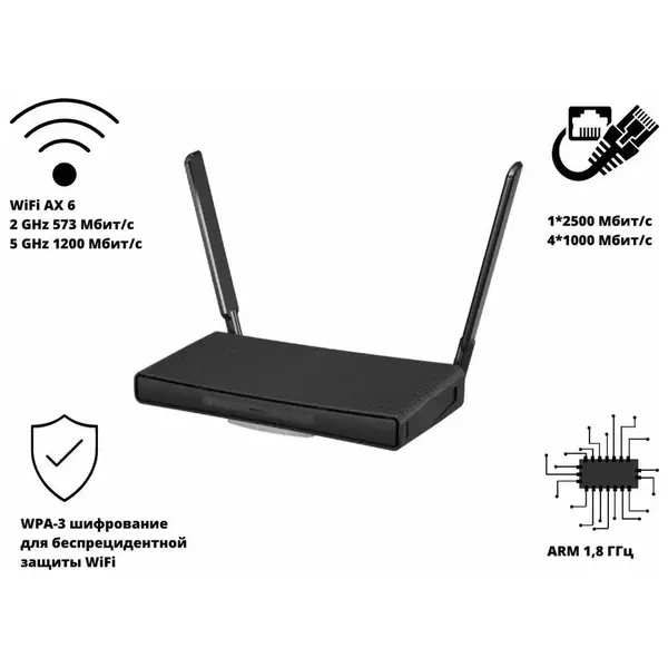 Mikrotik C53UiG+5HPaxD2HPaxD - это мощный двухдиапазонный маршрутизатор с поддержкой Wi-Fi 6 (AX1800), который идеально подходит для дома или небольшого офиса.