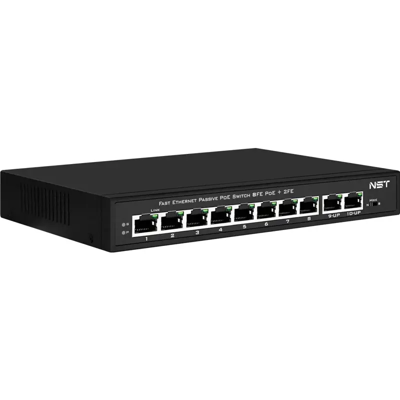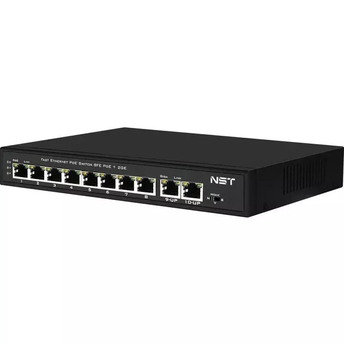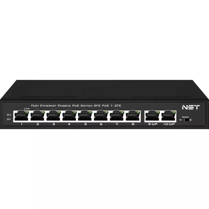 - Порты: 8 х FE (10/100 Base-T, 52V 4,5(+) 7,8(–)) совместимы с PoE (IEEE 802.3af/at), 2 x FE (10/100 Base-T) Uplink