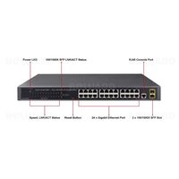 Особенности 24 порта RJ-45 10/100/1000 Мбит/с 2 порта 100/1000 Мбит/с SFP Максимальное расстояние передачи данных  до 550 м Расширенный...
