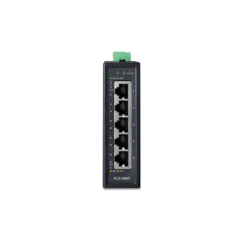 PLANET IGS-500T компактный промышленный гигабитный коммутатор который имеет 5-портов с автоопределением 10/100/1000T, подходящий для промышленного использования, в прочном, но компактный корпусе класса IP30 и резервную систему питания (12~48 В постоянного тока или 24 В переменного тока).