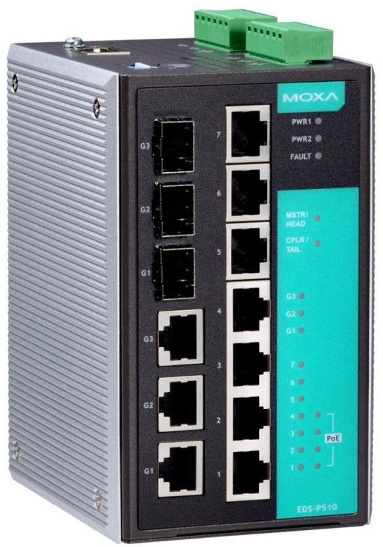 - PoE-коммутатор EDS-P510-T — достойный выбор управляемого свитча с поддержкой гигабитных стандартов резервирования связи и технологии PoE. На борту конструкции находятся 7 портов Fast Ethernet 10/100 Base TX и 3 гигабитных комбо-порта с разъемами RJ-45 или SFP для подключения оптических модулей. 4 из 7 LAN-портов поддерживают технологию Power-Over-Ethernet и могут передавать питание подключенным устройствам по сетевому кабелю. Литера «Т» в маркировке изделия свидетельствует о возможности безотказной работы при экстремальных температурах.