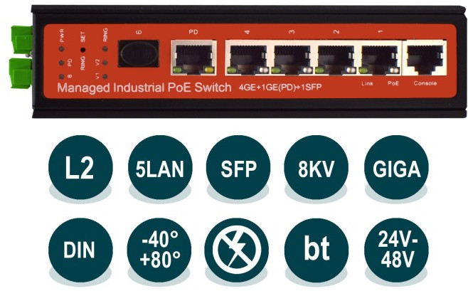 - Промышленный управляемый L2 коммутатор WI-PMS305GF-I предназначен для применения в индустриальных сетях предприятий. Коммутатор оснащен 5 портами 10/100/1000Base-Т с поддержкой PoE различных стандартов 802.3at/af/bt, Passive PoE 24В/48В, PoE-In и 1 портом SFP, сухими контактами, температурным датчиком, защищен от грязи, устойчив к электромагнитным помехам, нестабильному входному напряжению и сложным климатическим условиям.