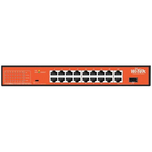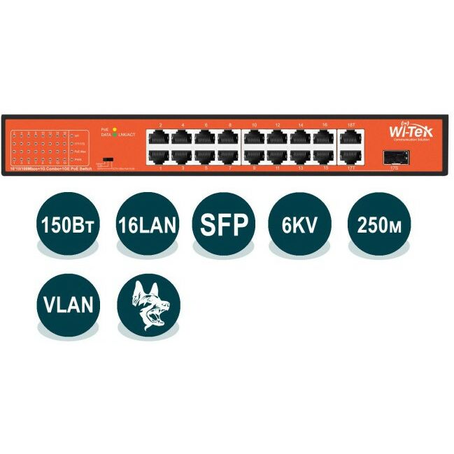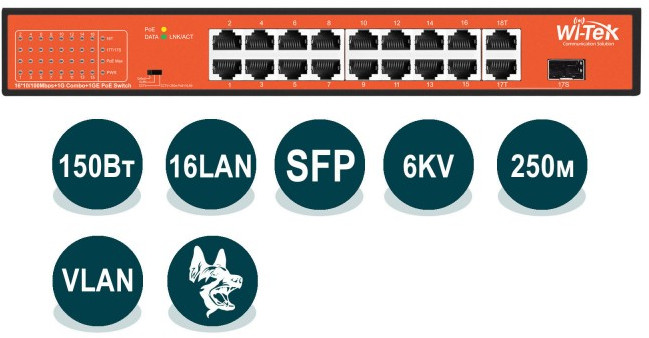 - Коммутатор оснащен 16 портами 100Base-TX с поддержкой PoE общей мощностью 150 Вт, 1 портом 1000Base-T, 1 портом Combo