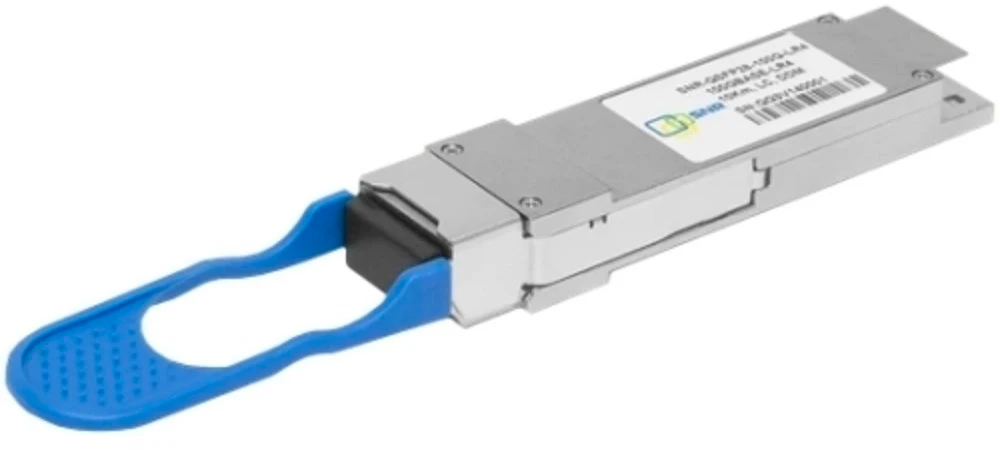 Компактный двухволоконный приемопередающий оптоэлектронный модуль (трансивер) форм-фактора QSFP28 с поддержкой «горячей» замены и напряжением питания 3,3В. Приемопередатчик предназначен для работы со скоростью передачи данных до 100 Гбит/с, что соответствует QSFP28 MSA. В качестве источника излучения используется EML-лазер, в качестве приемника – PIN-фотодетектор. Максимальная дальность связи – 500 м по одномодовому (9/125 мкм) оптическому волокну G.652.