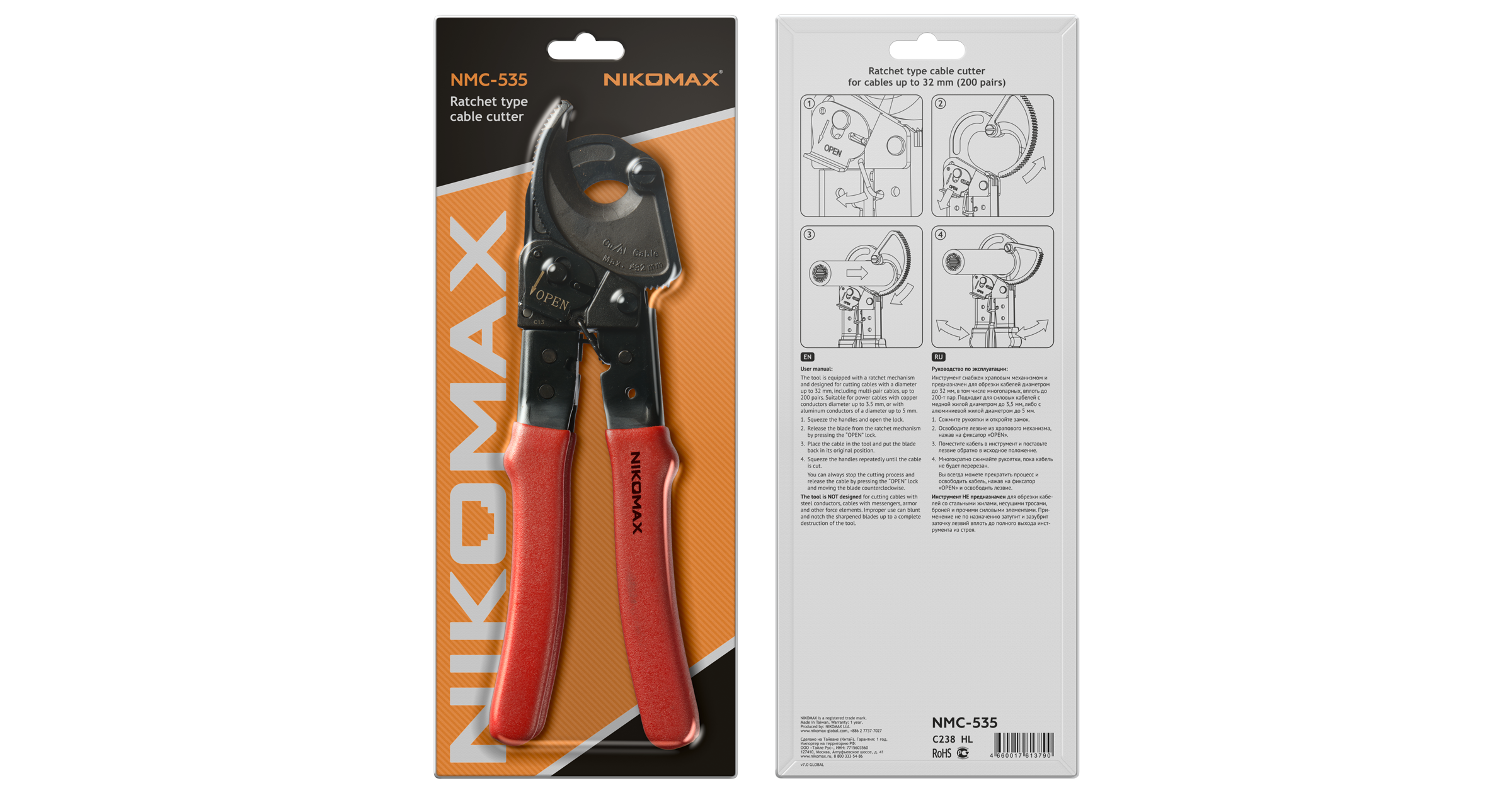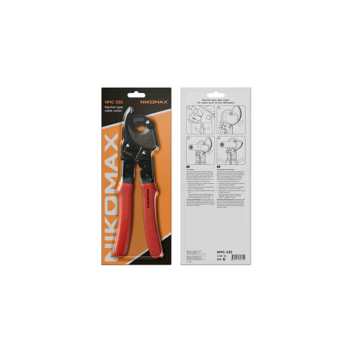 Инструмент NMC-535 снабжен храповым механизмом и предназначен для обрезки медных кабелей диаметром до 32 мм, в том числе многопарных, вплоть до 200-т пар. Также инструмент подходит для силовых кабелей с медной жилой диаметром до 3,5 мм, либо с алюминиевой жилой диаметром до 5 мм. Инструмент не предназначен для обрезки кабелей со стальными жилами, несущими тросами, броней и прочими силовыми элементами из твердых металлов.