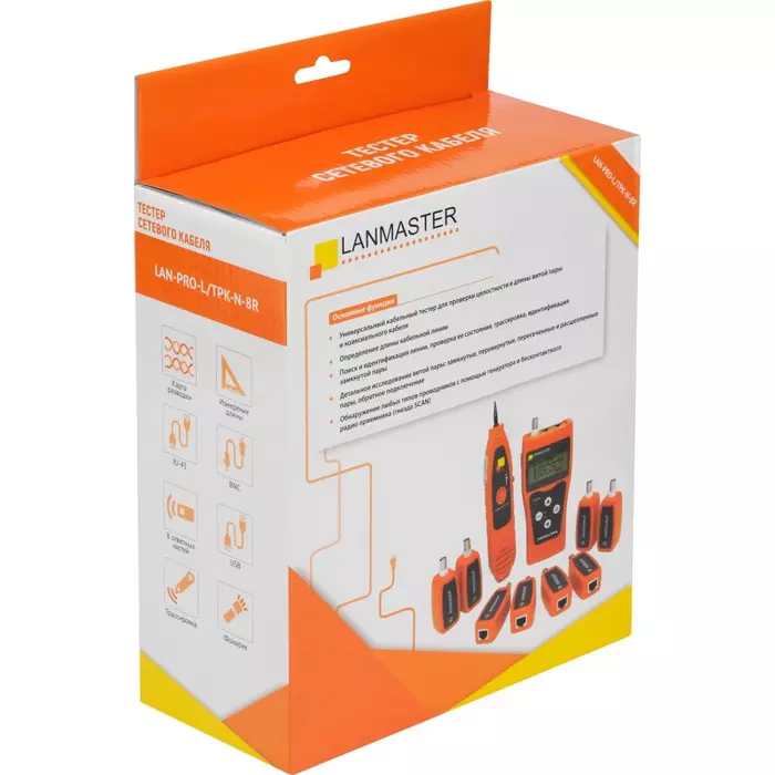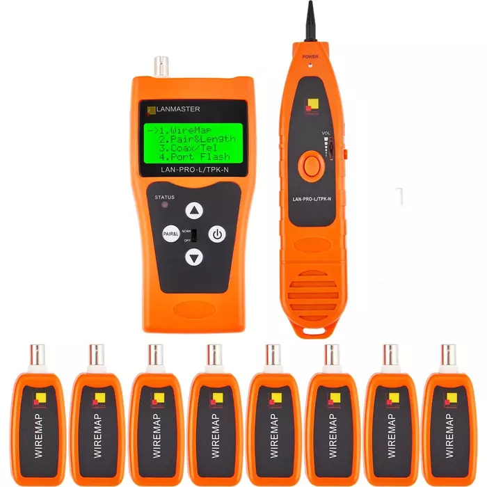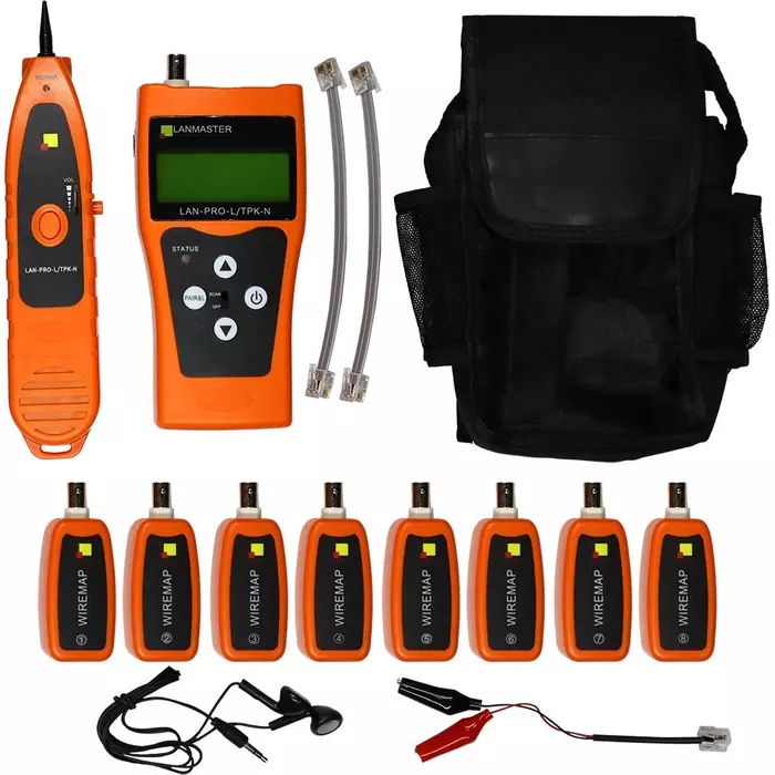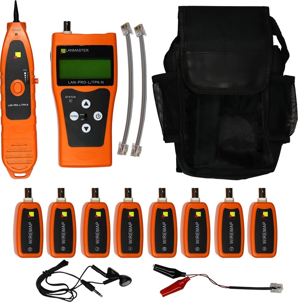 | Комплект поставки | Главный блок, индуктивный щуп, ответная часть - 8 шт., батарея 6F22 9V - 2 шт., кабель RJ45 - RJ45, кабель RJ11 - RJ11, кабель RJ11 - крокодилы, наушники, сумка-чехол на ремне, инструкция по эксплуатации. |