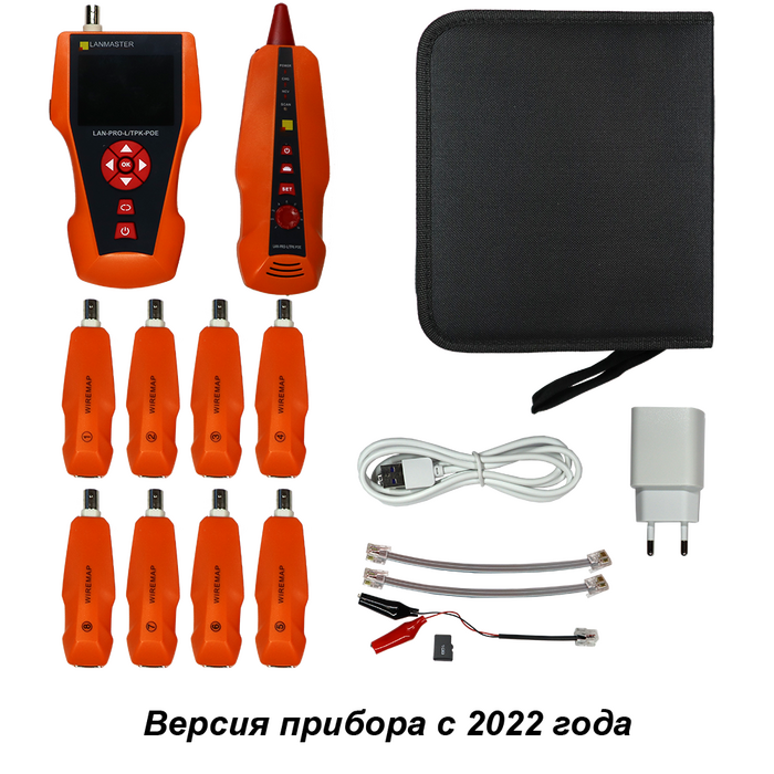 Комплект поставкиГлавный блок, индуктивный щуп, ответная часть - 8 шт., USB micro шнур, зарядное устройство, кабель RJ45, кабель RJ11, кабель RJ11 - крокодилы, карта памяти, сумка-чехол на ремне, инструкция по эксплуатации.