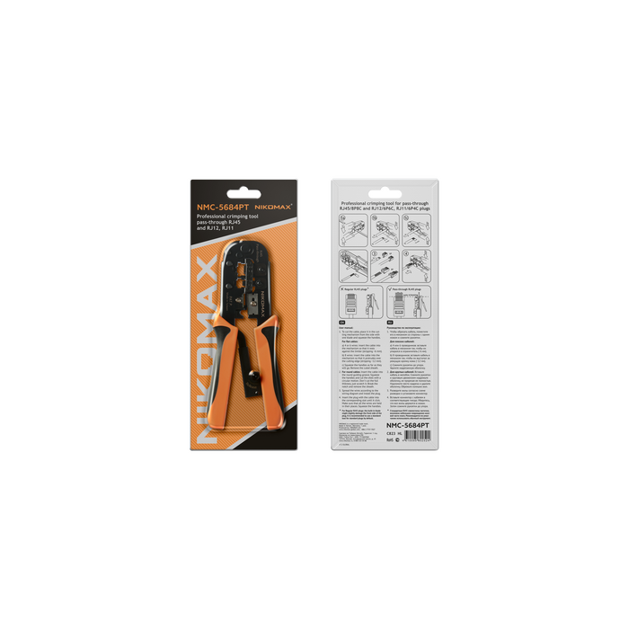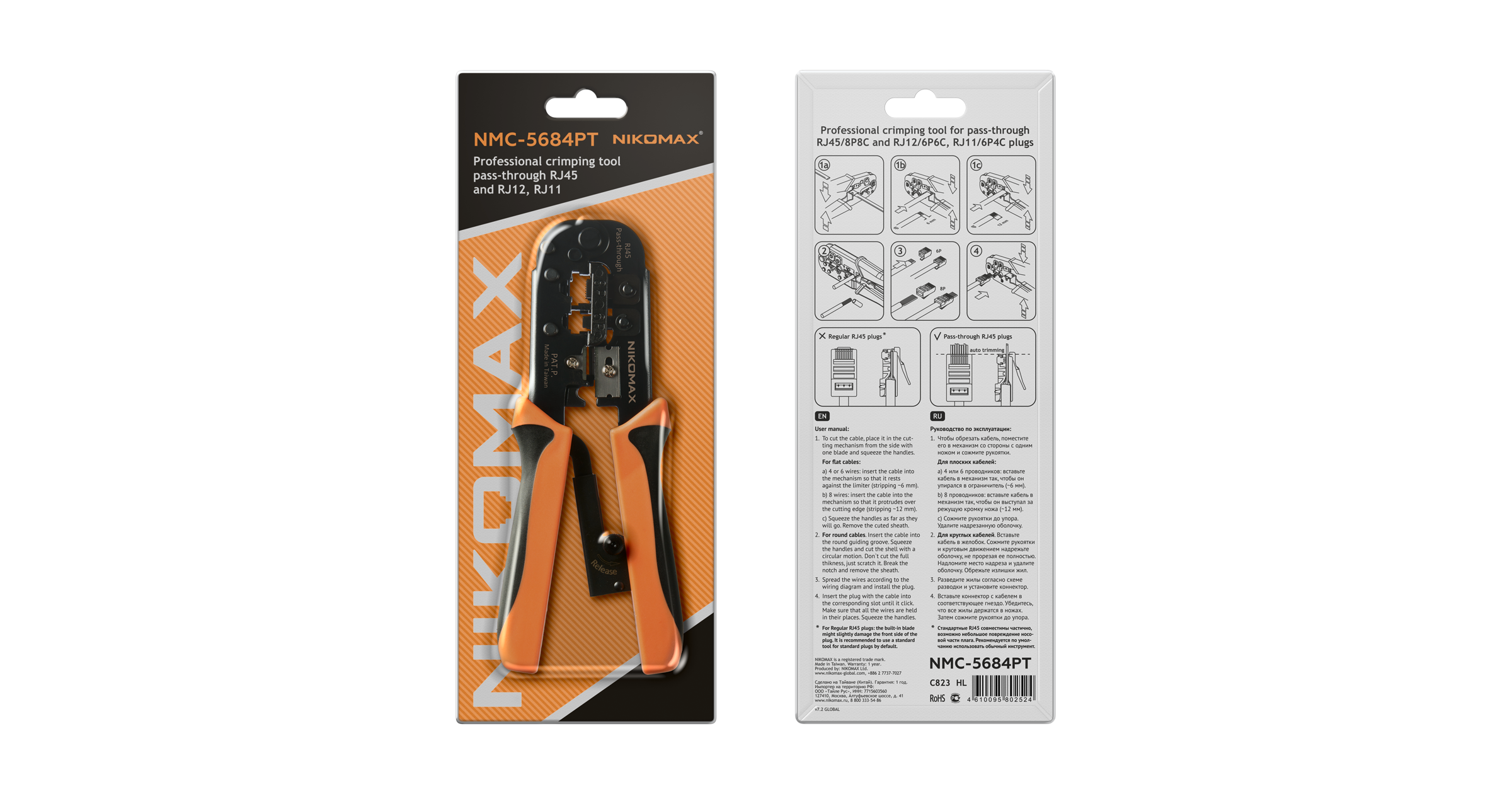 Обжимные инструменты (кримперы) предназначены для обжима коннекторов типа Registered Jack (RJ) на телефонных кабелях и кабелях передачи данных. Кримпер NMC-5684PT предназначен для обжима разъёмов типа RJ45/8P8C, RJ12/6P6C, RJ11/6P4C, 4P4C и 4P2C. Данный инструмент оборудован устройством для зачистки и обрезки кабеля, а также разработан специально для обжима проходных коннекторов серии PT (Pass-through plugs).