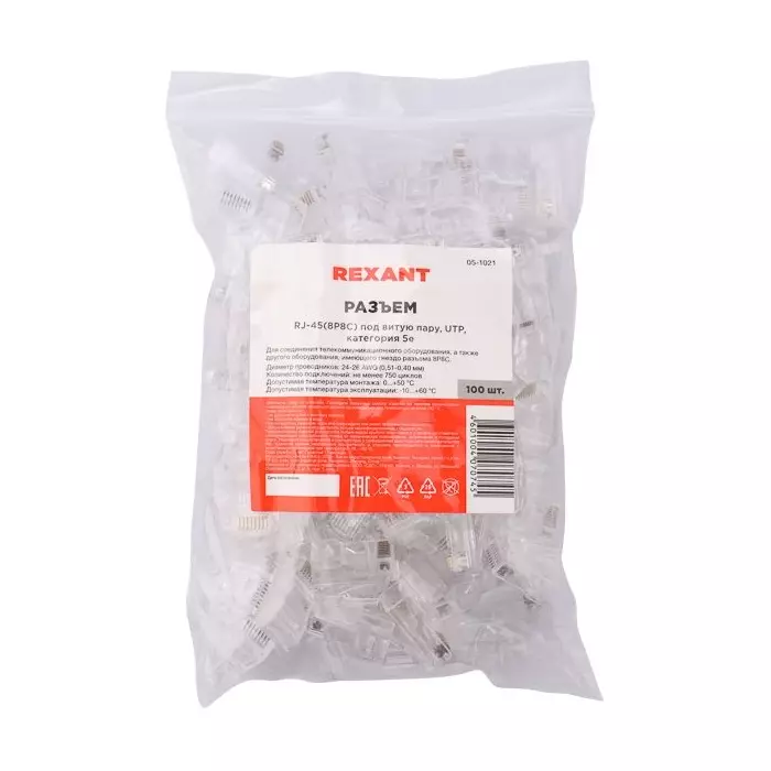 Коннектор Rexant 05-1021 UTP кат.5E RJ45 прозрачный