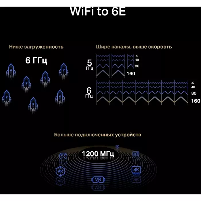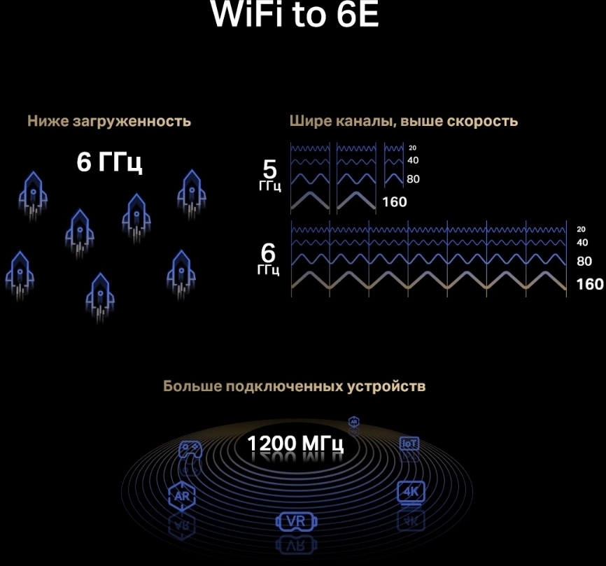 | Особенности | Три диапазона Wi-Fi — до 574 Мбит/с (2,4 ГГц) + до 2402 Мбит/с (5 ГГц) + до 2402 Мбит/с (6 ГГц).Wi-Fi 6E — позволит получить доступ к менее загруженному диапазону 6 ГГц.Большая площадь покрытия — за счёт двух высокопроизводительных антенн. |