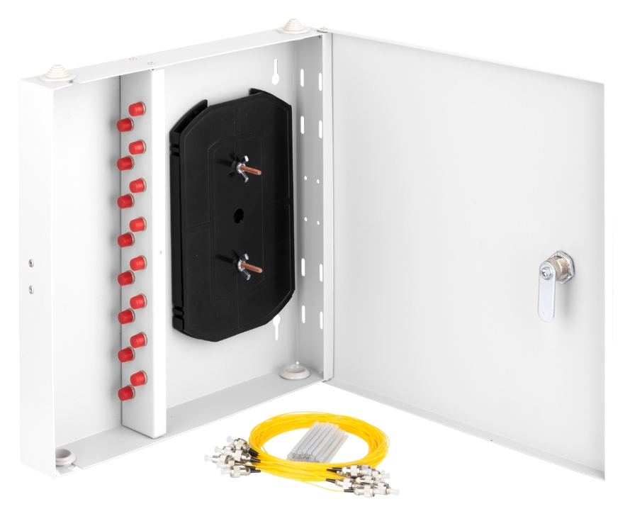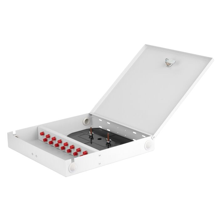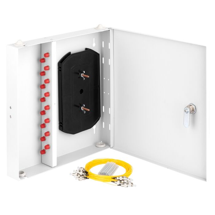 Оптический кросс Nikomax NMF-WP16FCUS2-IP-ES-GY NIKOMAX Essential Line, настенный, укомплектованный на 16 портов FC/UPC (16 одинарных FC/UPC адаптеров), SM 9/125 OS2, стальной, с ключом, серый, в комплекте: адаптеры, монтажные шнуры 1м, сплайс-кассета с к