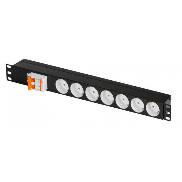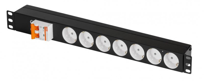 Блок электрических розеток TLK-RS07M-C25-BK в 19” стандарте с высотой 1U. Блок состоит из 7 «евророзеток» (Schuko), соединенных латунными шинами питания марки Л63Т с сечением 6 мм2 каждая. Блок розеток имеет автоматический выключатель 2/25А (по предварительному заказу модель автоматического выключателя может быть другая). Суммарный ток нагрузки — не более 25А. В задней части блока розеток имеется место для ввода кабеля питания (поставляется отдельно). Корпус изготовлен из оцинкованной стали толщиной 0,7 мм, все металлические элементы блока розеток заземлены, также имеется элемент крепления внешнего заземления (отверстие с резьбой М4).
