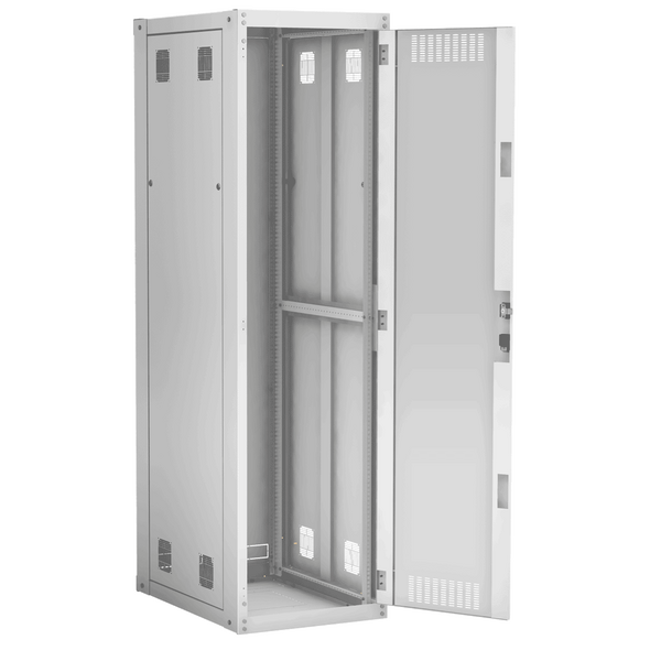 Наличие у шкафа двери с углом открытия 180 градусов и съемных боковых панелей и задней панели, предоставляет доступ для установки и обслуживания оборудования с четырех сторон.