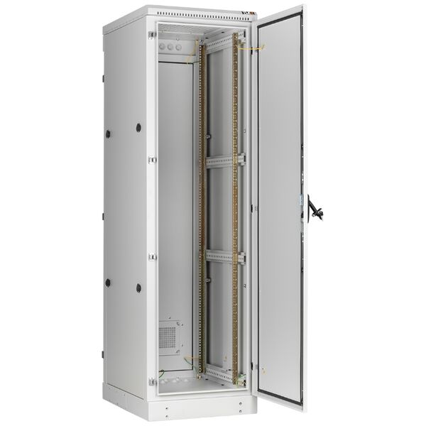 Система естественной вентиляции состоит из двух вентиляционных проемов, оснащенных съемными фильтрами. Один расположен в задней двери, а другой в потолочной панели. Принудительная вентиляция шкафа обеспечивается установкой вентиляторного блока TLK для напольных шкафов с фильтром.
