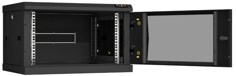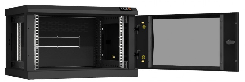 - Особенностью настенных шкафов серии TWC-R является сборно-разборная конструкция. Удобство сборки обеспечивается предустановленными комплектующими и фурнитуры. Дверь шкафа может быть цельнометаллическая, либо со вставкой из ударопрочного тонированного в массе стекла. Имеется возможность навесить дверь с правой либо с левой стороны. Дверь с углом открытия более 180 градусов и съемные боковые стенки, предоставляют удобный доступ в шкаф с трех сторон для установки и обслуживания оборудования. Фиксация двери и боковых стенок осуществляется точечными замками, при этом боковые стенки дополнительно оборудованы защелками быстрой фиксации. Задняя стенка спроектирована для двусторонней установки с выламываемыми заглушками кабельных вводов 270х56 мм. Для установки оборудования в шкафу предусмотрены две пары направляющих 19" с возможностью регулировки по глубине. Цифровая маркировка юнитовой (U) перфорации направляющих 19", создает дополнительное удобство для размещения оборудования. Вентиляцию шкафа обеспечивает перфорация основания и крыши. В крыше вместо съемной перфорированной заглушки, закрывающей отверстие 440х215 мм, возможна установка в качестве аксессуара одного из блоков вентиляторов TLK на два вентилятора для настенных шкафов. Вводные кабельные отверстия 270х56 мм в основании и крыше, закрытые съемными цельнометаллическими заглушками, можно оборудовать в качестве аксессуара щеточными вводами TLK. Количество кабельных вводов: в основании - 1 шт (заглушен), в крыше - 1 шт (заглушен), в задней стенке - 1 шт (выламываемый). Для крепления шкафа к стене в задней раме выполнены четыре монтажных отверстия, под анкерные болты М8. Для шкафа предусмотрены аксессуары TLK предоставляющие возможность, размещение шкафа на полу на регулируемых опорах TLK, а также изменение конструкции шкафа из односекционного в двухсекционный при помощи пристенной поворотной секции TLK. Все токопроводящие части шкафа заземляются между собой, образуя единый контур заземления. Антикоррозионное покрытие шкафа выполнено ударопрочной порошковой краской.