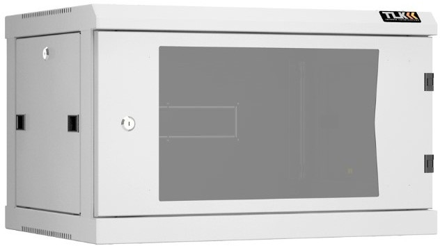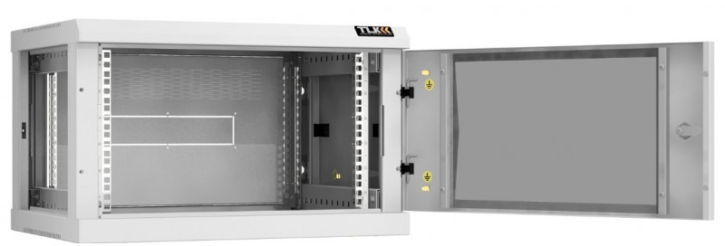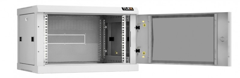 - Особенностью настенных шкафов серии TWC-R является сборно-разборная конструкция. Удобство сборки обеспечивается предустановленными комплектующими и фурнитуры. Дверь шкафа может быть цельнометаллическая, либо со вставкой из ударопрочного тонированного в массе стекла. Имеется возможность навесить дверь с правой либо с левой стороны. Дверь с углом открытия более 180 градусов и съемные боковые стенки, предоставляют удобный доступ в шкаф с трех сторон для установки и обслуживания оборудования. Фиксация двери и боковых стенок осуществляется точечными замками, при этом боковые стенки дополнительно оборудованы защелками быстрой фиксации. Задняя стенка спроектирована для двусторонней установки с выламываемыми заглушками кабельных вводов 270х56 мм. Для установки оборудования в шкафу предусмотрены две пары направляющих 19" с возможностью регулировки по глубине. Цифровая маркировка юнитовой (U) перфорации направляющих 19", создает дополнительное удобство для размещения оборудования. Вентиляцию шкафа обеспечивает перфорация основания и крыши. В крыше вместо съемной перфорированной заглушки, закрывающей отверстие 440х215 мм, возможна установка в качестве аксессуара одного из блоков вентиляторов TLK на два вентилятора для настенных шкафов. Вводные кабельные отверстия 270х56 мм в основании и крыше, закрытые съемными цельнометаллическими заглушками, можно оборудовать в качестве аксессуара щеточными вводами TLK. Количество кабельных вводов: в основании - 1 шт (заглушен), в крыше - 1 шт (заглушен), в задней стенке - 1 шт (выламываемый). Для крепления шкафа к стене в задней раме выполнены четыре монтажных отверстия, под анкерные болты М8. Для шкафа предусмотрены аксессуары TLK предоставляющие возможность, размещение шкафа на полу на регулируемых опорах TLK, а также изменение конструкции шкафа из односекционного в двухсекционный при помощи пристенной поворотной секции TLK. Все токопроводящие части шкафа заземляются между собой, образуя единый контур заземления. Антикоррозионное покрытие шкафа выполнено ударопрочной порошковой краской.