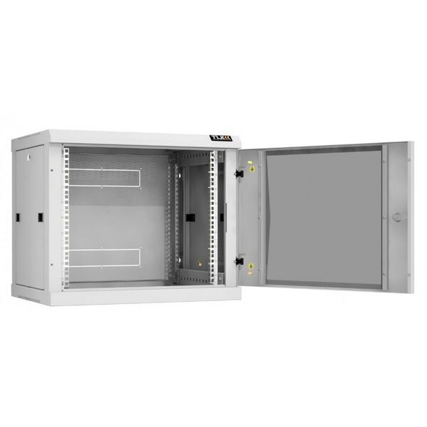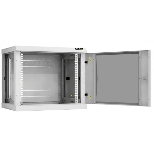 - Особенностью настенных шкафов серии TWC-R является сборно-разборная конструкция. Удобство сборки обеспечивается предустановленными комплектующими и фурнитуры. Дверь шкафа может быть цельнометаллическая, либо со вставкой из ударопрочного тонированного в массе стекла. Имеется возможность навесить дверь с правой либо с левой стороны. Дверь с углом открытия более 180 градусов и съемные боковые стенки, предоставляют удобный доступ в шкаф с трех сторон для установки и обслуживания оборудования. Фиксация двери и боковых стенок осуществляется точечными замками, при этом боковые стенки дополнительно оборудованы защелками быстрой фиксации. Задняя стенка спроектирована для двусторонней установки с выламываемыми заглушками кабельных вводов 270х56 мм. Для установки оборудования в шкафу предусмотрены две пары направляющих 19" с возможностью регулировки по глубине. Цифровая маркировка юнитовой (U) перфорации направляющих 19", создает дополнительное удобство для размещения оборудования. Вентиляцию шкафа обеспечивает перфорация основания и крыши. В крыше вместо съемной перфорированной заглушки, закрывающей отверстие 440х215 мм, возможна установка в качестве аксессуара одного из блоков вентиляторов TLK на два вентилятора для настенных шкафов. Вводные кабельные отверстия 270х56 мм в основании и крыше, закрытые съемными цельнометаллическими заглушками, можно оборудовать в качестве аксессуара щеточными вводами TLK. Количество кабельных вводов: в основании - 1 шт (заглушен), в крыше - 1 шт (заглушен), в задней стенке - 1 шт (выламываемый). Для крепления шкафа к стене в задней раме выполнены четыре монтажных отверстия, под анкерные болты М8. Для шкафа предусмотрены аксессуары TLK предоставляющие возможность, размещение шкафа на полу на регулируемых опорах TLK, а также изменение конструкции шкафа из односекционного в двухсекционный при помощи пристенной поворотной секции TLK. Все токопроводящие части шкафа заземляются между собой, образуя единый контур заземления. Антикоррозионное покрытие шкафа выполнено ударопрочной порошковой краской.