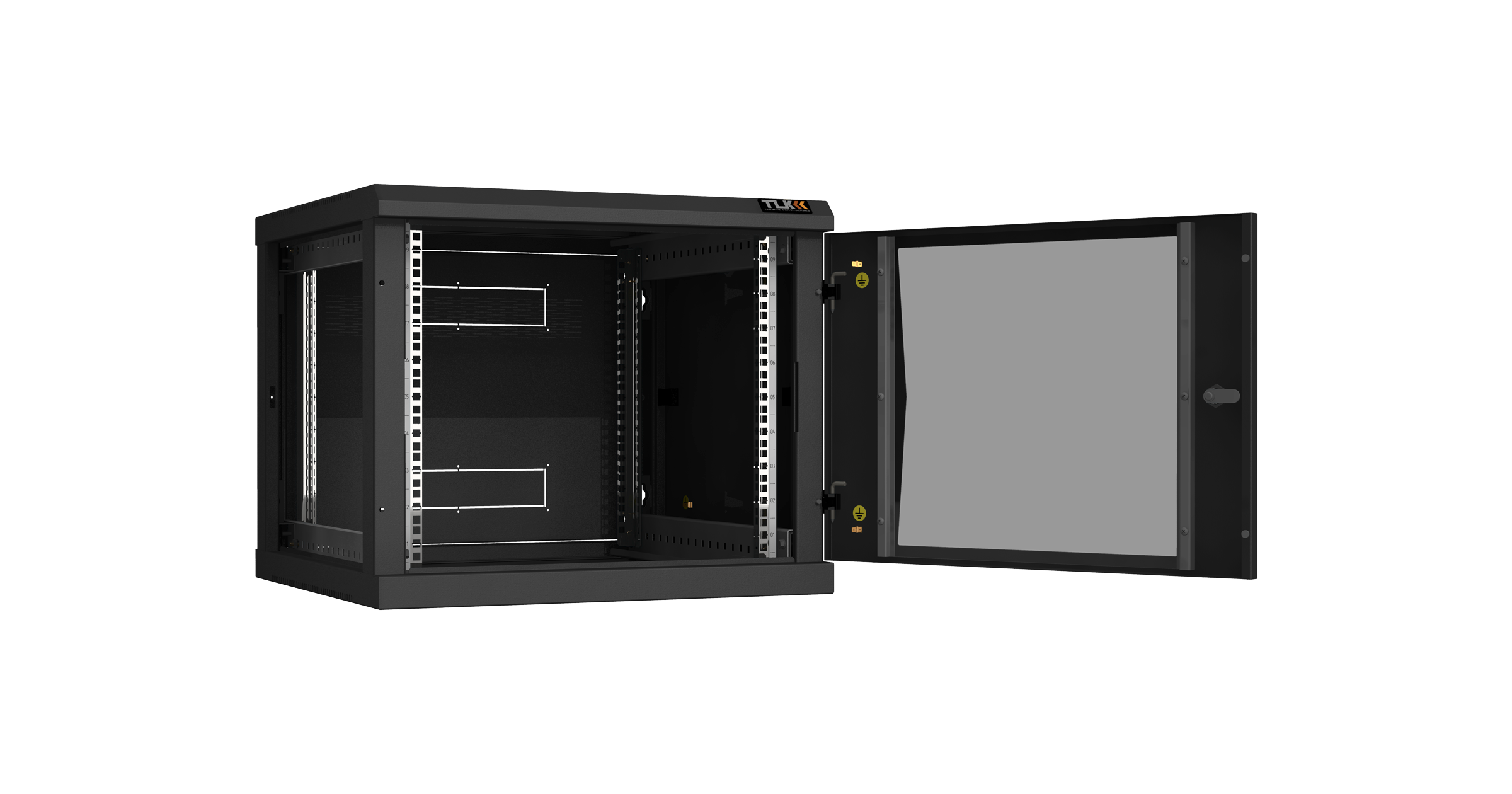 Особенностью настенных шкафов серии TWC-R является сборно-разборная конструкция. Удобство сборки обеспечивается предустановленными комплектующими и фурнитуры. Дверь шкафа может быть цельнометаллическая, либо со вставкой из ударопрочного тонированного в массе стекла. Имеется возможность навесить дверь с правой либо с левой стороны. Дверь с углом открытия более 180 градусов и съемные боковые стенки, предоставляют удобный доступ в шкаф с трех сторон для установки и обслуживания оборудования. Фиксация двери и боковых стенок осуществляется точечными замками, при этом боковые стенки дополнительно оборудованы защелками быстрой фиксации.
