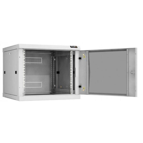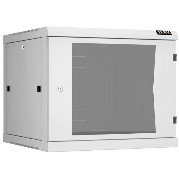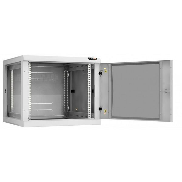 - Особенностью настенных шкафов серии TWC-R является сборно-разборная конструкция. Удобство сборки обеспечивается предустановленными комплектующими и фурнитуры. Дверь шкафа может быть цельнометаллическая, либо со вставкой из ударопрочного тонированного в массе стекла. Имеется возможность навесить дверь с правой либо с левой стороны. Дверь с углом открытия более 180 градусов и съемные боковые стенки, предоставляют удобный доступ в шкаф с трех сторон для установки и обслуживания оборудования. Фиксация двери и боковых стенок осуществляется точечными замками, при этом боковые стенки дополнительно оборудованы защелками быстрой фиксации. Задняя стенка спроектирована для двусторонней установки с выламываемыми заглушками кабельных вводов 270х56 мм. Для установки оборудования в шкафу предусмотрены две пары направляющих 19" с возможностью регулировки по глубине. Цифровая маркировка юнитовой (U) перфорации направляющих 19", создает дополнительное удобство для размещения оборудования. Вентиляцию шкафа обеспечивает перфорация основания и крыши. В крыше вместо съемной перфорированной заглушки, закрывающей отверстие 440х215 мм, возможна установка в качестве аксессуара одного из блоков вентиляторов TLK на два вентилятора для настенных шкафов. Вводные кабельные отверстия 270х56 мм в основании и крыше, закрытые съемными цельнометаллическими заглушками, можно оборудовать в качестве аксессуара щеточными вводами TLK. Количество кабельных вводов: в основании - 1 шт (заглушен), в крыше - 1 шт (заглушен), в задней стенке - 1 шт (выламываемый). Для крепления шкафа к стене в задней раме выполнены четыре монтажных отверстия, под анкерные болты М8. Для шкафа предусмотрены аксессуары TLK предоставляющие возможность, размещение шкафа на полу на регулируемых опорах TLK, а также изменение конструкции шкафа из односекционного в двухсекционный при помощи пристенной поворотной секции TLK. Все токопроводящие части шкафа заземляются между собой, образуя единый контур заземления. Антикоррозионное покрытие шкафа выполнено ударопрочной порошковой краской.