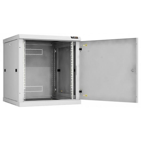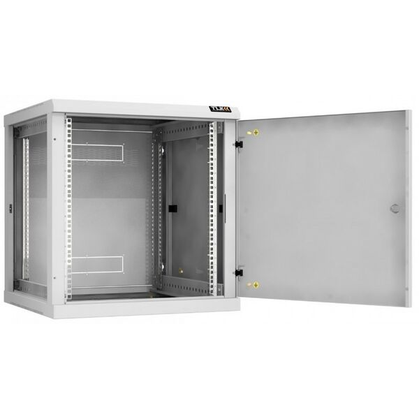 - Особенностью настенных шкафов серии TWC-R является сборно-разборная конструкция. Удобство сборки обеспечивается предустановленными комплектующими и фурнитуры. Дверь шкафа может быть цельнометаллическая, либо со вставкой из ударопрочного тонированного в массе стекла. Имеется возможность навесить дверь с правой либо с левой стороны. Дверь с углом открытия более 180 градусов и съемные боковые стенки, предоставляют удобный доступ в шкаф с трех сторон для установки и обслуживания оборудования. Фиксация двери и боковых стенок осуществляется точечными замками, при этом боковые стенки дополнительно оборудованы защелками быстрой фиксации. Задняя стенка спроектирована для двусторонней установки с выламываемыми заглушками кабельных вводов 270х56 мм. Для установки оборудования в шкафу предусмотрены две пары направляющих 19" с возможностью регулировки по глубине. Цифровая маркировка юнитовой (U) перфорации направляющих 19", создает дополнительное удобство для размещения оборудования. Вентиляцию шкафа обеспечивает перфорация основания и крыши. В крыше вместо съемной перфорированной заглушки, закрывающей отверстие 440х215 мм, возможна установка в качестве аксессуара одного из блоков вентиляторов TLK на два вентилятора для настенных шкафов. Вводные кабельные отверстия 270х56 мм в основании и крыше, закрытые съемными цельнометаллическими заглушками, можно оборудовать в качестве аксессуара щеточными вводами TLK. Количество кабельных вводов: в основании - 1 шт (заглушен), в крыше - 1 шт (заглушен), в задней стенке - 1 шт (выламываемый). Для крепления шкафа к стене в задней раме выполнены четыре монтажных отверстия, под анкерные болты М8. Для шкафа предусмотрены аксессуары TLK предоставляющие возможность, размещение шкафа на полу на регулируемых опорах TLK, а также изменение конструкции шкафа из односекционного в двухсекционный при помощи пристенной поворотной секции TLK. Все токопроводящие части шкафа заземляются между собой, образуя единый контур заземления. Антикоррозионное покрытие шкафа выполнено ударопрочной порошковой краской.