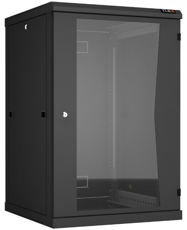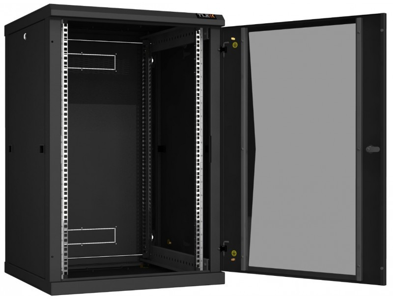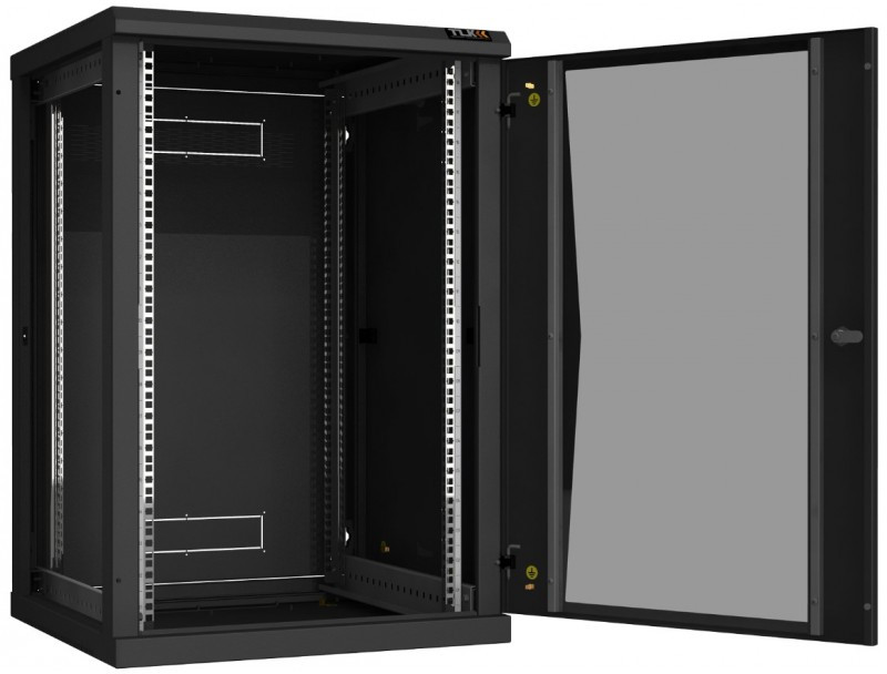 - Особенностью настенных шкафов серии TWC-R является сборно-разборная конструкция. Удобство сборки обеспечивается предустановленными комплектующими и фурнитуры. Дверь шкафа может быть цельнометаллическая, либо со вставкой из ударопрочного тонированного в массе стекла. Имеется возможность навесить дверь с правой либо с левой стороны. Дверь с углом открытия более 180 градусов и съемные боковые стенки, предоставляют удобный доступ в шкаф с трех сторон для установки и обслуживания оборудования. Фиксация двери и боковых стенок осуществляется точечными замками, при этом боковые стенки дополнительно оборудованы защелками быстрой фиксации. Задняя стенка спроектирована для двусторонней установки с выламываемыми заглушками кабельных вводов 270х56 мм. Для установки оборудования в шкафу предусмотрены две пары направляющих 19" с возможностью регулировки по глубине. Цифровая маркировка юнитовой (U) перфорации направляющих 19", создает дополнительное удобство для размещения оборудования. Вентиляцию шкафа обеспечивает перфорация основания и крыши. В крыше вместо съемной перфорированной заглушки, закрывающей отверстие 440х215 мм, возможна установка в качестве аксессуара одного из блоков вентиляторов TLK на два вентилятора для настенных шкафов. Вводные кабельные отверстия 270х56 мм в основании и крыше, закрытые съемными цельнометаллическими заглушками, можно оборудовать в качестве аксессуара щеточными вводами TLK. Количество кабельных вводов: в основании - 1 шт (заглушен), в крыше - 1 шт (заглушен), в задней стенке - 1 шт (выламываемый). Для крепления шкафа к стене в задней раме выполнены четыре монтажных отверстия, под анкерные болты М8. Для шкафа предусмотрены аксессуары TLK предоставляющие возможность, размещение шкафа на полу на регулируемых опорах TLK, а также изменение конструкции шкафа из односекционного в двухсекционный при помощи пристенной поворотной секции TLK. Все токопроводящие части шкафа заземляются между собой, образуя единый контур заземления. Антикоррозионное покрытие шкафа выполнено ударопрочной порошковой краской.