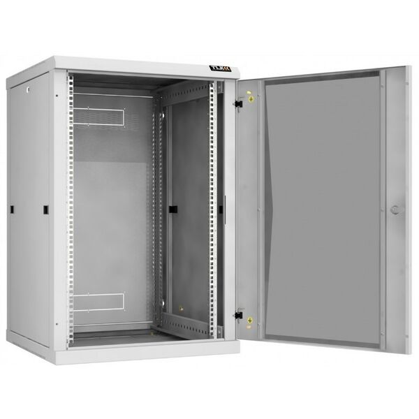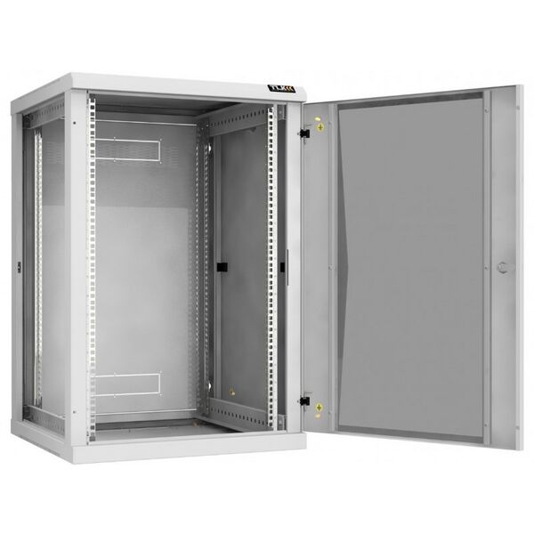 - Особенностью настенных шкафов серии TWC-R является сборно-разборная конструкция. Удобство сборки обеспечивается предустановленными комплектующими и фурнитуры. Дверь шкафа может быть цельнометаллическая, либо со вставкой из ударопрочного тонированного в массе стекла. Имеется возможность навесить дверь с правой либо с левой стороны. Дверь с углом открытия более 180 градусов и съемные боковые стенки, предоставляют удобный доступ в шкаф с трех сторон для установки и обслуживания оборудования. Фиксация двери и боковых стенок осуществляется точечными замками, при этом боковые стенки дополнительно оборудованы защелками быстрой фиксации. Задняя стенка спроектирована для двусторонней установки с выламываемыми заглушками кабельных вводов 270х56 мм. Для установки оборудования в шкафу предусмотрены две пары направляющих 19" с возможностью регулировки по глубине. Цифровая маркировка юнитовой (U) перфорации направляющих 19", создает дополнительное удобство для размещения оборудования. Вентиляцию шкафа обеспечивает перфорация основания и крыши. В крыше вместо съемной перфорированной заглушки, закрывающей отверстие 440х215 мм, возможна установка в качестве аксессуара одного из блоков вентиляторов TLK на два вентилятора для настенных шкафов. Вводные кабельные отверстия 270х56 мм в основании и крыше, закрытые съемными цельнометаллическими заглушками, можно оборудовать в качестве аксессуара щеточными вводами TLK. Количество кабельных вводов: в основании - 1 шт (заглушен), в крыше - 1 шт (заглушен), в задней стенке - 1 шт (выламываемый). Для крепления шкафа к стене в задней раме выполнены четыре монтажных отверстия, под анкерные болты М8. Для шкафа предусмотрены аксессуары TLK предоставляющие возможность, размещение шкафа на полу на регулируемых опорах TLK, а также изменение конструкции шкафа из односекционного в двухсекционный при помощи пристенной поворотной секции TLK. Все токопроводящие части шкафа заземляются между собой, образуя единый контур заземления. Антикоррозионное покрытие шкафа выполнено ударопрочной порошковой краской.