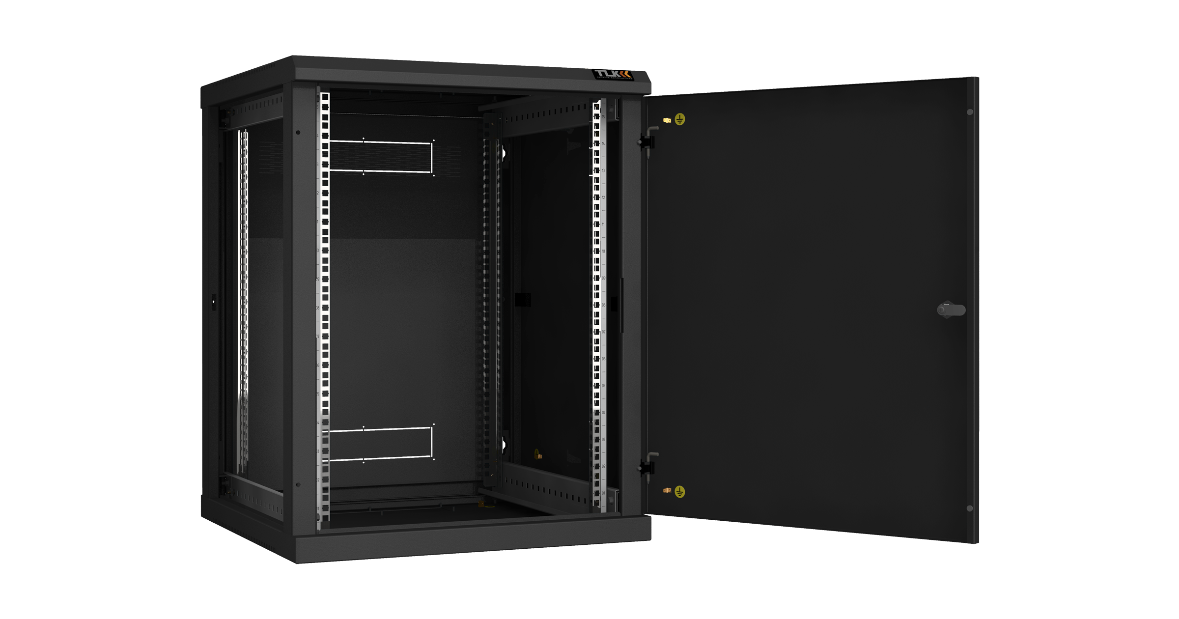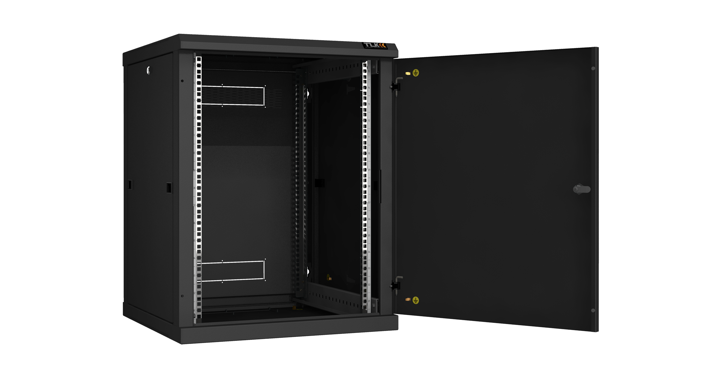 Для установки оборудования в шкафу предусмотрены две пары направляющих 19" с возможностью регулировки по глубине. Цифровая маркировка юнитовой (U) перфорации направляющих 19", создает дополнительное удобство для размещения оборудования. Вентиляцию шкафа обеспечивает перфорация основания и крыши. В крыше вместо съемной перфорированной заглушки, закрывающей отверстие 440х215 мм, возможна установка в качестве аксессуара одного из блоков вентиляторов TLK на два вентилятора для настенных шкафов.