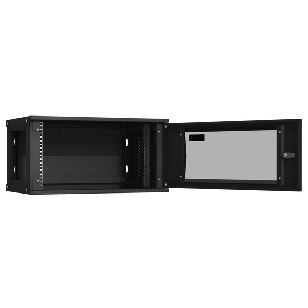 Сборно-разборная конструкция шкафа, состоящая из малого набора конструктивных элементов обеспечивает надежный конструктив и простоту сборки. Крепление шкафа к стене осуществляется через монтажные отверстия в задней стенке шкафа. (Крепеж не входит в комплект поставки). Дверь шкафа снабжена замком и может быть выполнена из стального листа с перфорацией или со вставкой из тонированного в массе стекла. Имеется возможность навесить дверь с правой или с левой стороны. Угол открытия двери — 180 градусов.