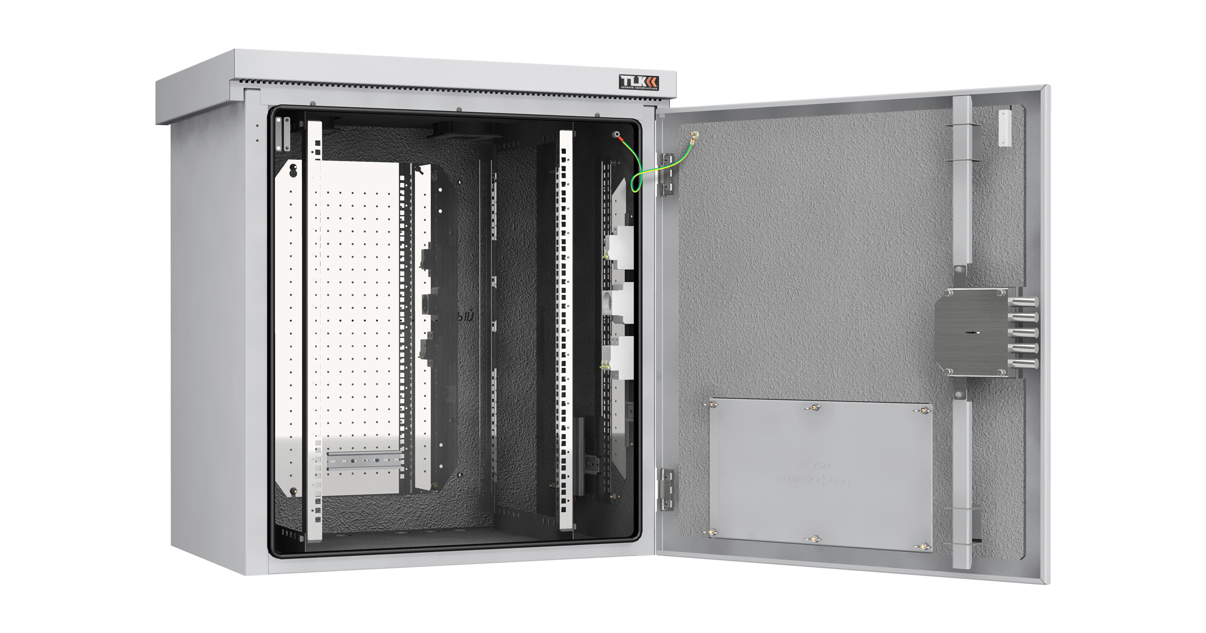 Расстояние между направляющими: по глубине - 307 мм, по ширине - 450 мм. В основании шкафа расположена съемная панель с герметичными кабельными вводами в количестве 6 штук. Дверь шкафа имеет скрытые петли, уплотнительный контур и оборудована надежным пятиригельным замком с трехточечным запиранием, без выступающих частей. Поддержание необходимого микроклимата в шкафу обеспечивается системой принудительной вентиляции и обогрева, управляемой термостатом.