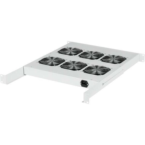 Вентиляторная полка предназначена для создания дополнительного потока воздуха в местах сосредоточения активного оборудования в телекоммуникационном шкафу. Вентиляторные полки можно устанавливать в напольные шкафы и стойки в соответствии с таблицей совместимости аксессуаров. Питание вентиляторной полки осуществляется с помощью подключения шнура питания к сети с напряжением 220 В, 50 Гц. Разъем питания на вентиляторном блоке типа IEC-60320 C14. Вентиляторная полка выполнена в 19” стандарте. Несущая конструкция вентиляторной полки выполнена из 2 мм стали. Вентиляторы закрыты решетками с обеих сторон. Включение/выключение полки осуществляются пользователем. Полка крепятся к направляющим с помощью комплекта крепежа. Крепеж не входит в комплект поставки. Антикоррозионное покрытие выполнено ударопрочной порошковой краской светло-серого цвета. Вентиляторная полка на 6 вентиляторов, глубиной 520 мм, снабжена дополнительными кронштейнами для крепления за заднюю часть. Кронштейны можно регулировать по вылету для подстройки под глубину направляющих шкафа.