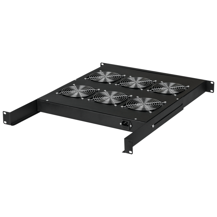 Вентиляторная полка предназначена для создания дополнительного потока воздуха в местах сосредоточения активного оборудования в телекоммуникационном шкафу. Вентиляторные полки можно устанавливать в напольные шкафы и стойки в соответствии с таблицей совместимости аксессуаров. Питание вентиляторной полки осуществляется с помощью подключения шнура питания к сети с напряжением 220 В, 50 Гц. Разъем питания на вентиляторном блоке типа IEC-60320 C14. Вентиляторная полка выполнена в 19” стандарте. Несущая конструкция вентиляторной полки выполнена из 2 мм стали. Вентиляторы закрыты решетками с обеих сторон. Включение/выключение полки осуществляются пользователем. Полка крепятся к направляющим с помощью комплекта крепежа. Крепеж не входит в комплект поставки. Антикоррозионное покрытие выполнено ударопрочной порошковой краской черного цвета. Вентиляторная полка на 6 вентиляторов, глубиной 520 мм, снабжена дополнительными кронштейнами для крепления за заднюю часть. Кронштейны можно регулировать по вылету для подстройки под глубину направляющих шкафа.