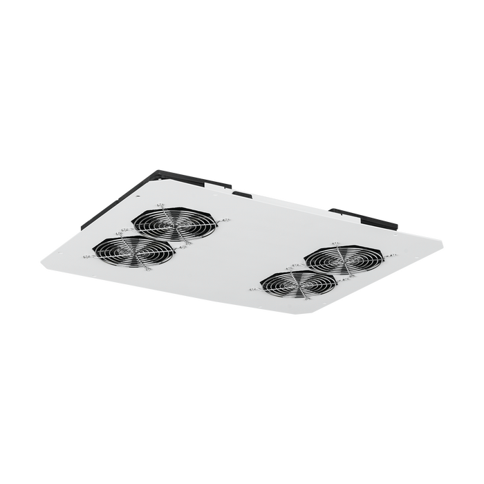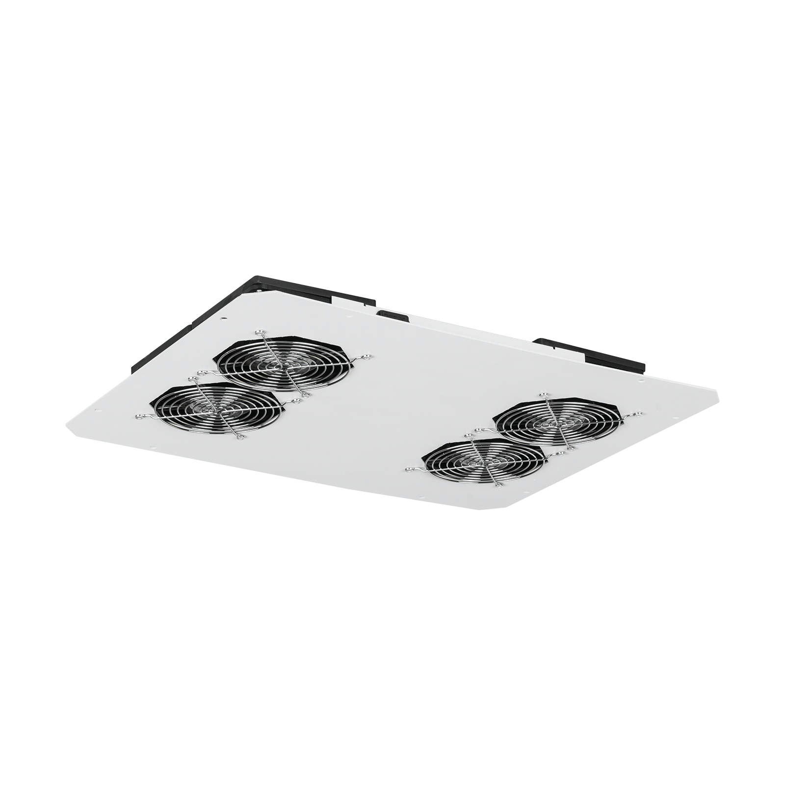 Питание вентиляторного блока на 4 вентилятора осуществляется с помощью подключения шнура питания к сети с напряжением 220 В, 50 Гц. Разъем питания на вентиляторном блоке типа IEC-60320 C14. Вентиляторы закрыты решетками с обеих сторон. Блок с маркировкой «F» имеет встроенные фильтры для предотвращения засасывания пыли во внутреннее пространство шкафа. Вентиляторный блок конструктивно выполнен с монтажным фланцем для удобства установки. Несущая конструкция вентиляторного блока выполнена из 2 мм стали. Антикоррозионное и декоративное покрытие выполнено ударопрочной порошковой краской светло-серого цвета.